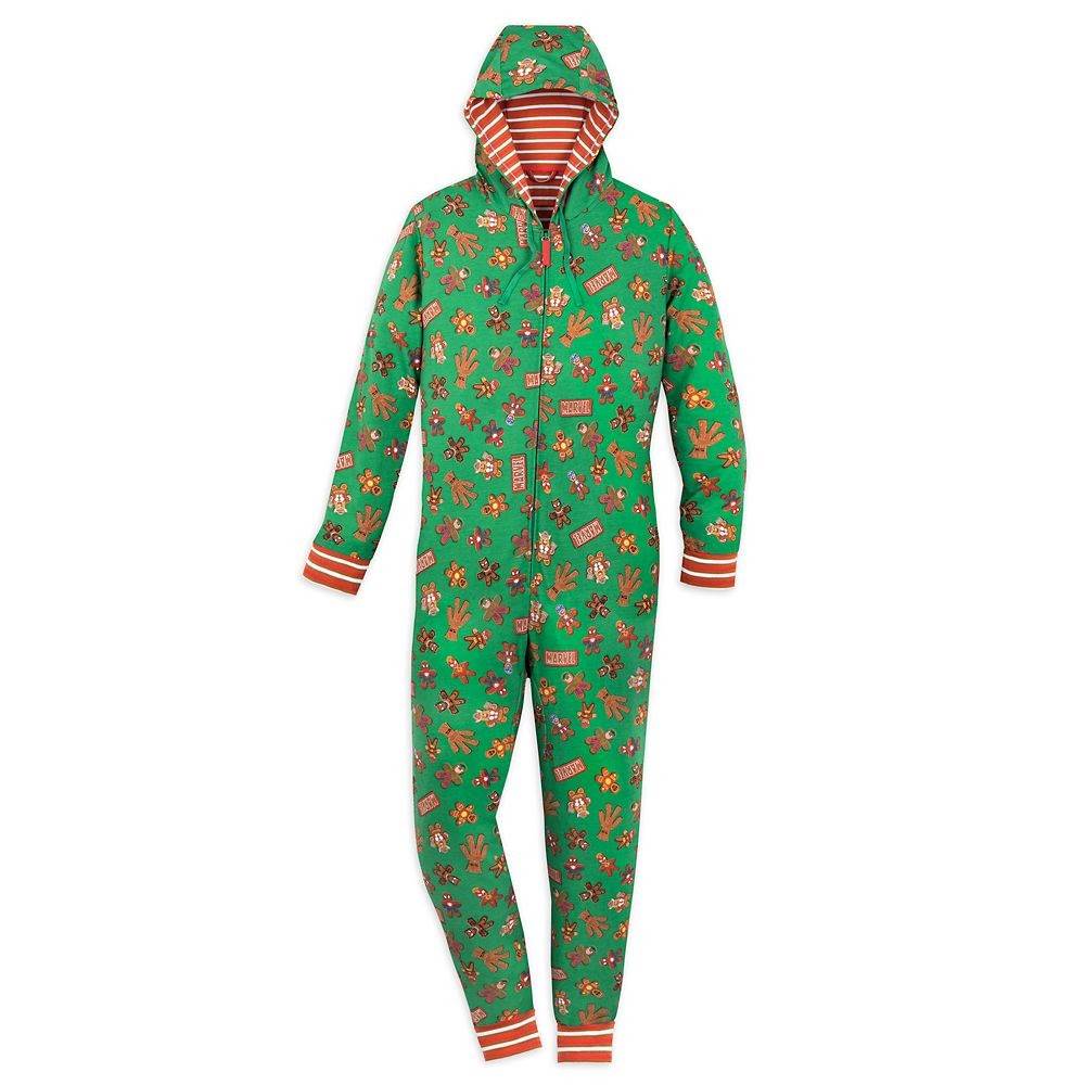 Next, we’re having tons of fun with this adult bodysuit—complete with hood!—that has a Marvel Studios theme. It’s bright green with red and white striped cuffs and covered in gingerbread cookie cutouts of heroes like Spider-Man, Hulk, and Captain Marvel.