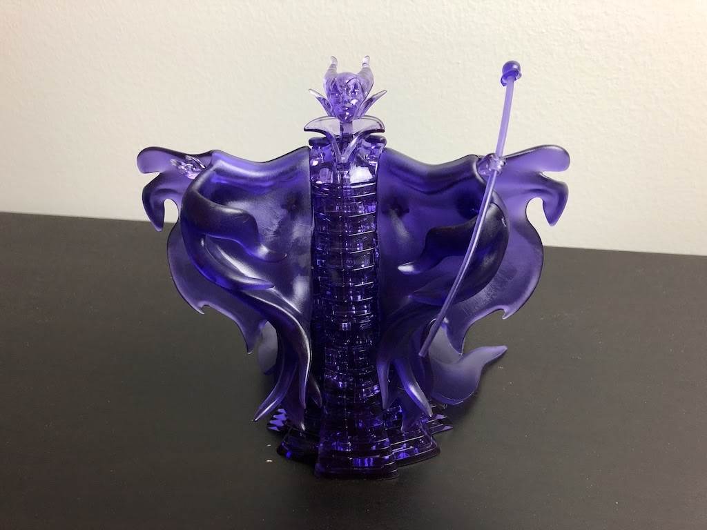 With two level one puzzles under my belt, I was ready for the Level 3 challenge, Maleficent. This gorgeous deep purple figure has extra details like a staff and cape to really capture her foreboding essence. For Mal I changed up my routine and organized the pieces by number in rows of ten. The sorting process was much faster and I figured I’d have no problem selecting which piece I needed next. I was right, assembly was a breeze. I did struggle with positioning her arms and attaching the cape, but this was not nearly as frustrating and my four minute debacle with Stitch’s feet! Unlike the rigid quality of the base pieces, the cape was soft and flexible plastic that reminded me of fruit leather. Total build time for the 74 piece Maleficent came in at 26 minutes and 34 seconds.