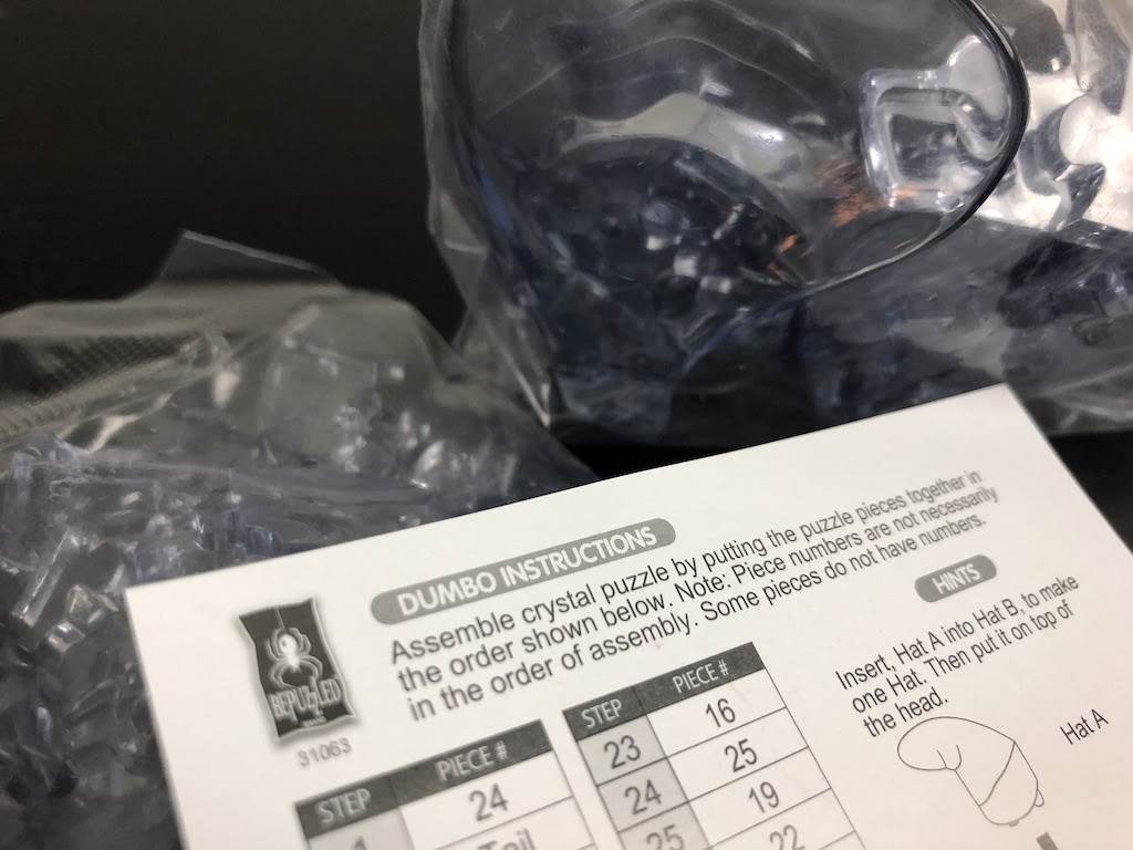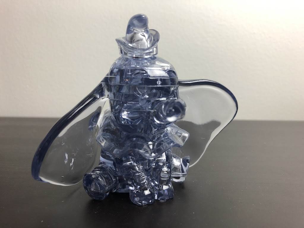 I chose the Dumbo puzzle first because it seemed like it was the most simplistic of the trio and now that I’ve done them all, I think my assessment was correct. The puzzle is transparent grey and looks really lovely when complete. However this particular puzzle doesn’t have a base. I decided to time myself on the actual build time, but left out the sorting of the pieces. For Dumbo I put all 40 pieces in order that I’d use them. This proved to be a challenge but made a huge difference (I assume) in building. I struggled a few times with pieces that needed to be inverted (upside down) but ultimately enjoyed the level of difficulty. His hat proved to be rather tricky for me, but I eventually figured it out. All in all it took me 13 minutes and 8 seconds to finish Dumbo. A satisfying time and one I could easily beat with my next puzzle.