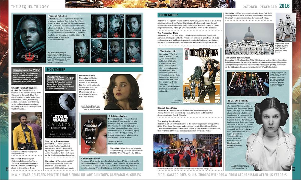 Then Wallace tackles the “Dark Times,” the period from the mid-80s through the early 90s during which there wasn’t a tremendous amount of Star Wars content being produced, though he does manage to find plenty to talk about anyway, and fortunately this era ends with the then-flourishing Expanded Universe of novels and comic books, plus the relaunch of Hasbro’s popular Star Wars action figure line. And after Hidalgo tackles the prequel trilogy and The Clone Wars animated series, he and Baver take on the new stuff: basically everything that has happened since Disney bought Lucasfilm. It’s particularly interesting how all of these authors place milestones in the Star Wars timeline within the context of real-world current events such as numerous NASA space launches all the way up through the January 6 insurrection at the U.S. Capitol building this year. The vast majority of entries are accompanied by illustrations, set photography, and/or poster art promoting the various releases documented within, and it was great to be reminded of events I had forgotten about– not to mention more than a few I had the wonderful opportunity of attending myself, such as Star Wars Celebrations and movie premieres.