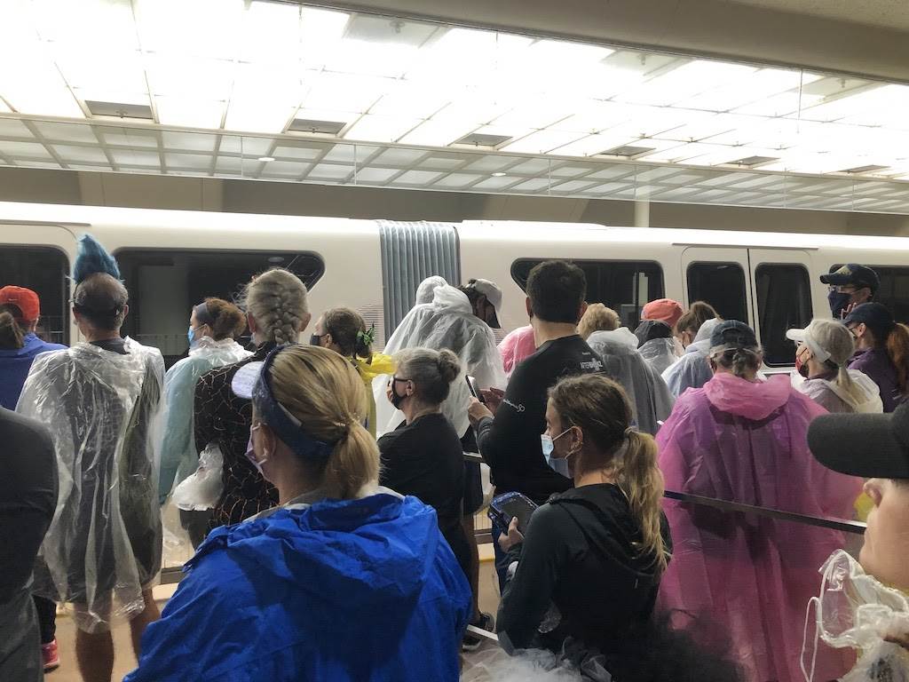 According to the weather app, this morning was supposed to be slightly chilly and dry until 8am, but my friends, that was not the case. It drizzled from the time we left our hotel at 3:30 am, all the way until 7am. Still we persisted! We arrived at EPCOT and parked in the Discovery section of the massive lot. From there we walked to the Monorail station for a ride to the Magic Kingdom Transportation and Ticket Center and then one more walk to the parking lot and our starting groups.