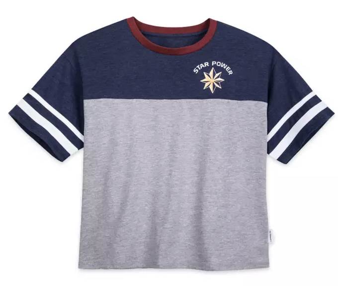 - Strike the colors of Captain Marvel in this sporty, semi-cropped top by Her Universe. Sleeve stripes, contrast yoke, and ''star power'' icon send you off on cosmic missions with style to spare.