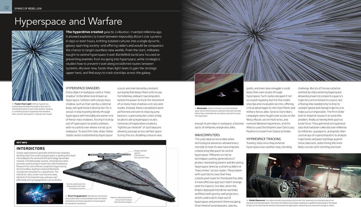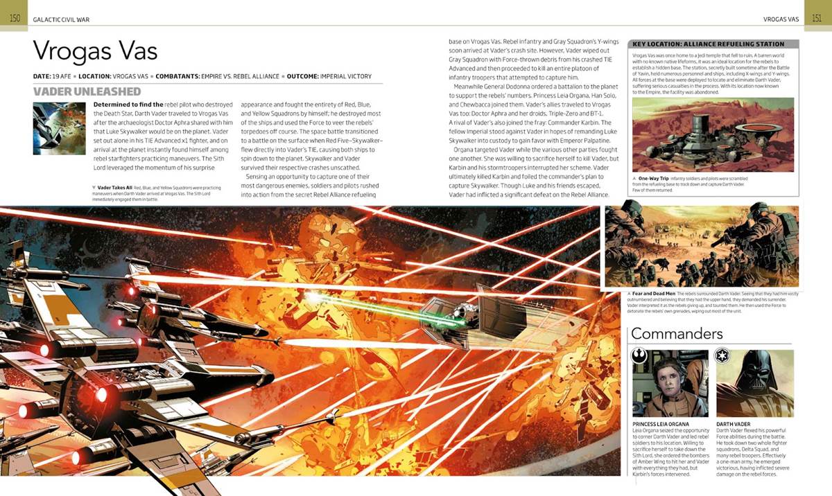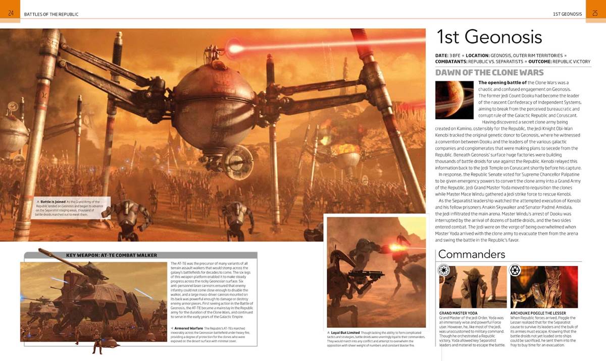 Battles That Changed the Galaxy is divided into four sections: “Battles of the Republic” (covering the events of the Star Wars prequel trilogy and The Clone Wars animated series), “Sparks of the Rebellion” (Solo: A Star Wars Story, Star Wars Rebels, and early parts of Rogue One) “Galactic Civil War” (from the Battle of Scarif through the war’s end at Jakku, the video games Star Wars Battlefront II and Star Wars: Squadrons, and elements of The Mandalorian), and “First Order-Resistance War” (documenting the Disney-produced sequel trilogy and Star Wars Resistance). Each section begins with a handy, clearly laid-out timeline, arranged in a way that will help readers more easily understand the sequence in which all of this combat unfolded in-universe. Then the pages dedicated to the specific battles spell out the reasons why they happened, how exactly they were fought, who was in charge of each side, and of course which faction ultimately emerged victorious.