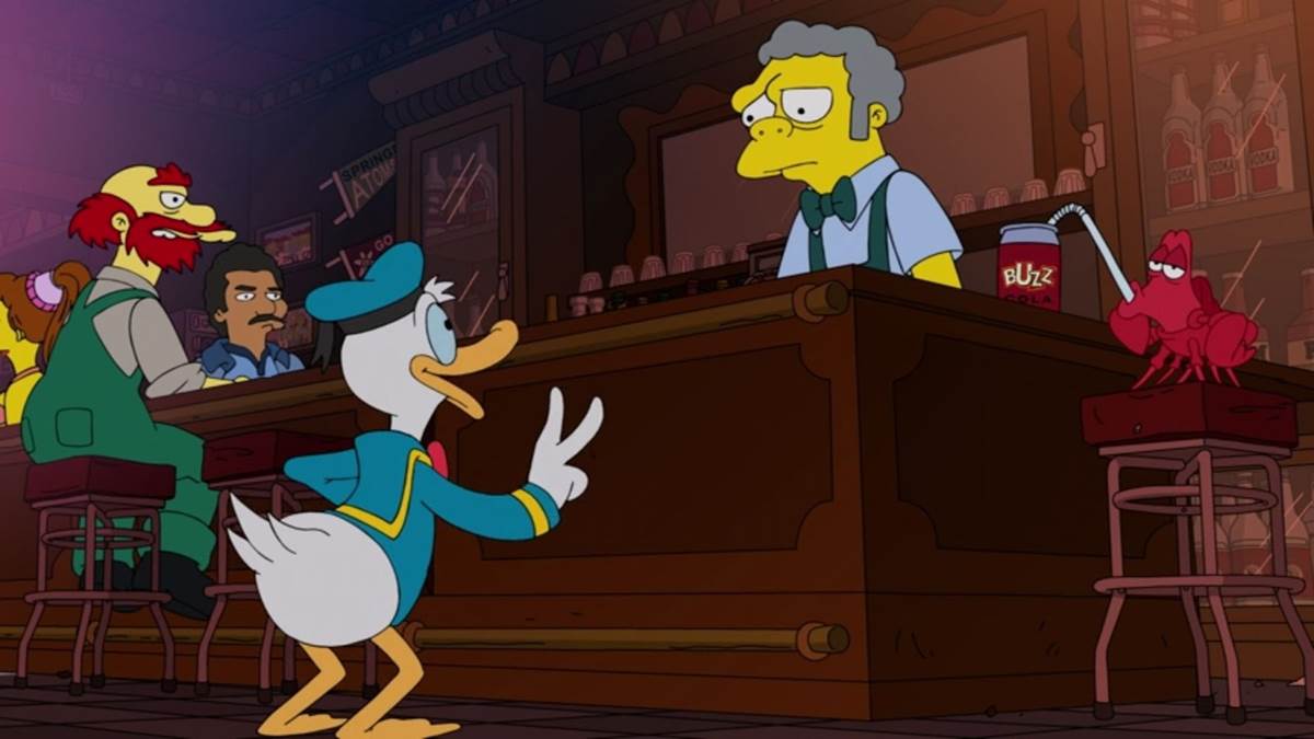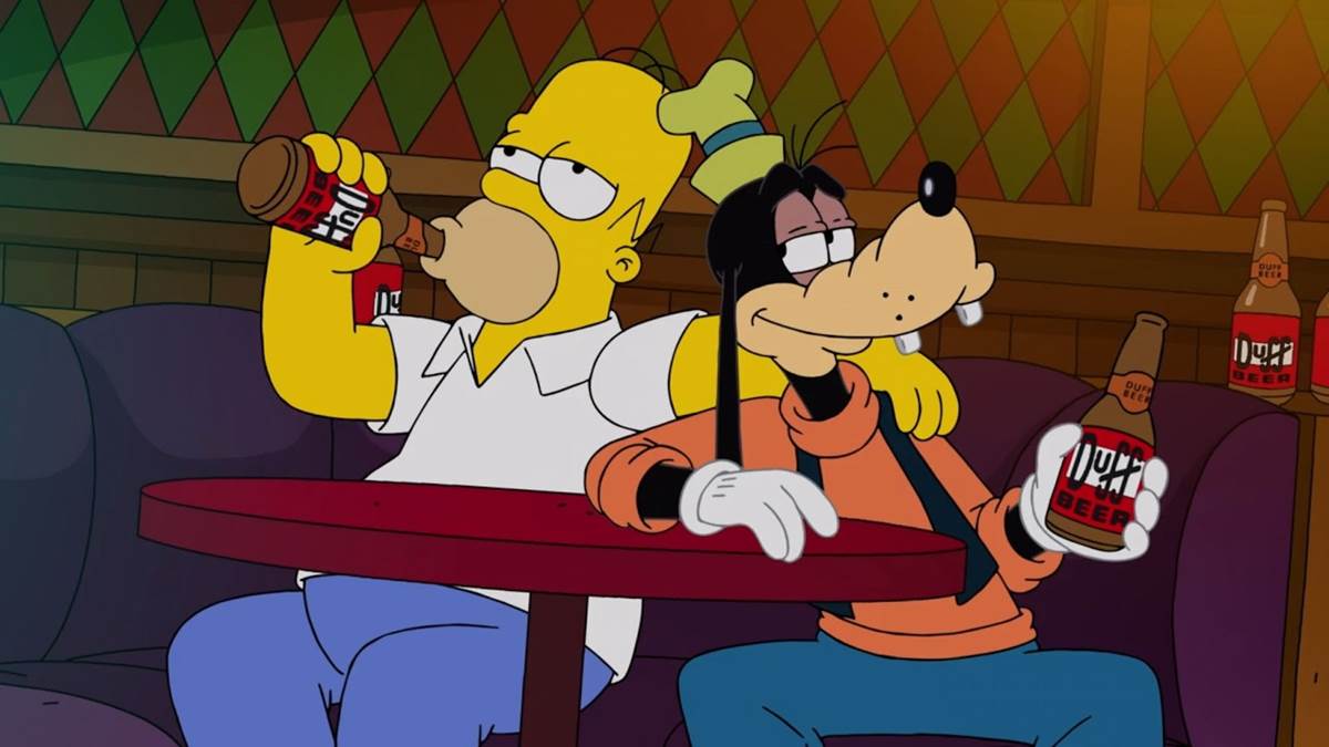 It’s the second anniversary of the 2019 launch of Disney+, and all the stars have gathered for a Disney+ Day celebration at Moe’s Tavern in Springfield, where Maui and Wreck-It Ralph are working as bouncers and Maleficent runs the check-in table. Homer Simpson (voiced, as always, by Dan Castellaneta) isn’t on the list, and he complains that Winnie the Pooh is allowed into the party: “He isn’t even wearing pants!” But when Goofy shows up without a (Disney) plus-one, Homer sees his chance and accompanies the intellectually challenged character into the bar.