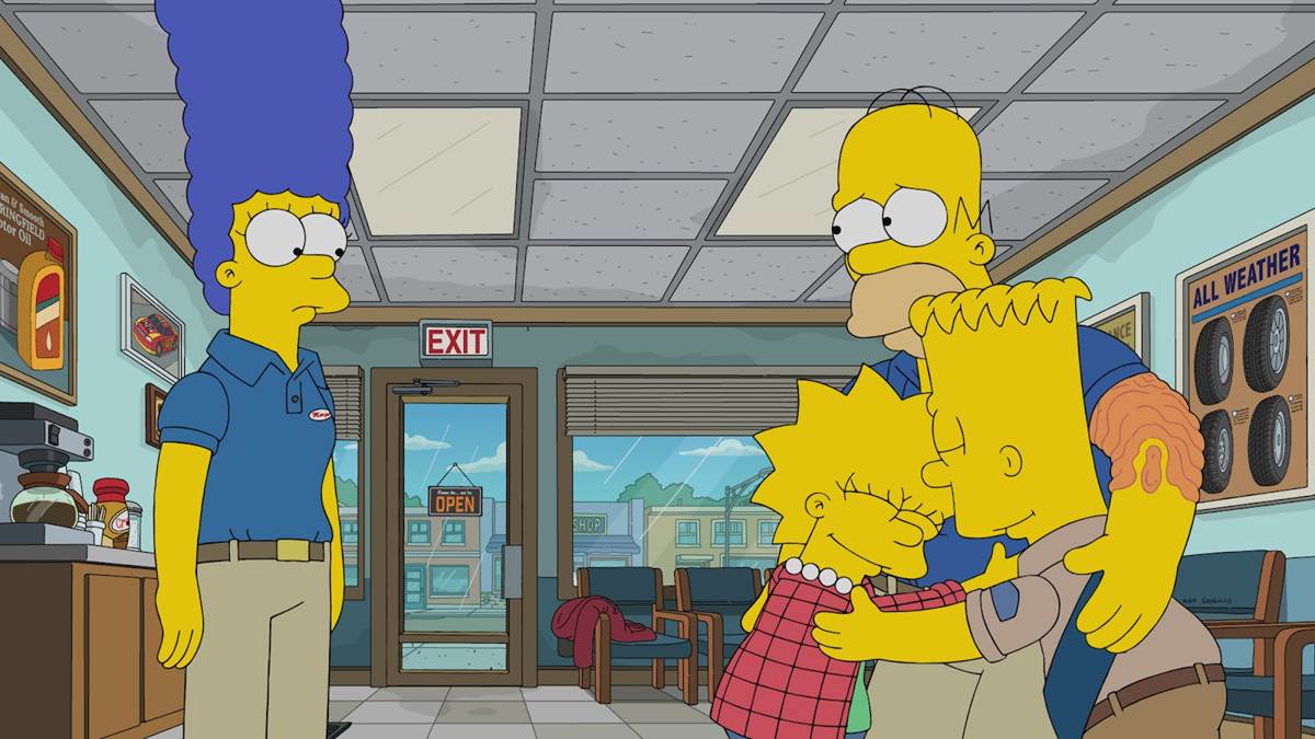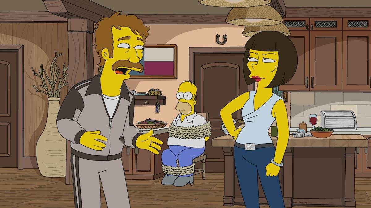 A teenage Bart enters the shop, having earned his “Online Citizenship” badge at the Boy Scouts “for being polite on social media.” Then Lisa comes in, saying she got 100 RSVPs to her birthday party from people who probably just want to meet Homer, who receives a mysterious blank postcard from Wyoming. “Probably just junk,” he says, tearing it up and throwing it in the trash. But later, after driving past Ned Flanders’s now-boarded-up house, Homer parks his car in a garage and switches to a red pickup truck, putting on a blonde wig. He drives to a diner and eats breakfast, and we see a montage of him in various disguises around town. Later he hikes into the woods and makes his way past a booby trap, but is then held at shotgun-point by Rod and Todd Flanders. Ned emerges from behind a tree and takes Homer to a cabin, where he unpacks the supplies that his friend has brought him. Ned asks how things are in Springfield. “Marge hates me,” Homer weeps, “all because I saved that money’s life and not yours.”