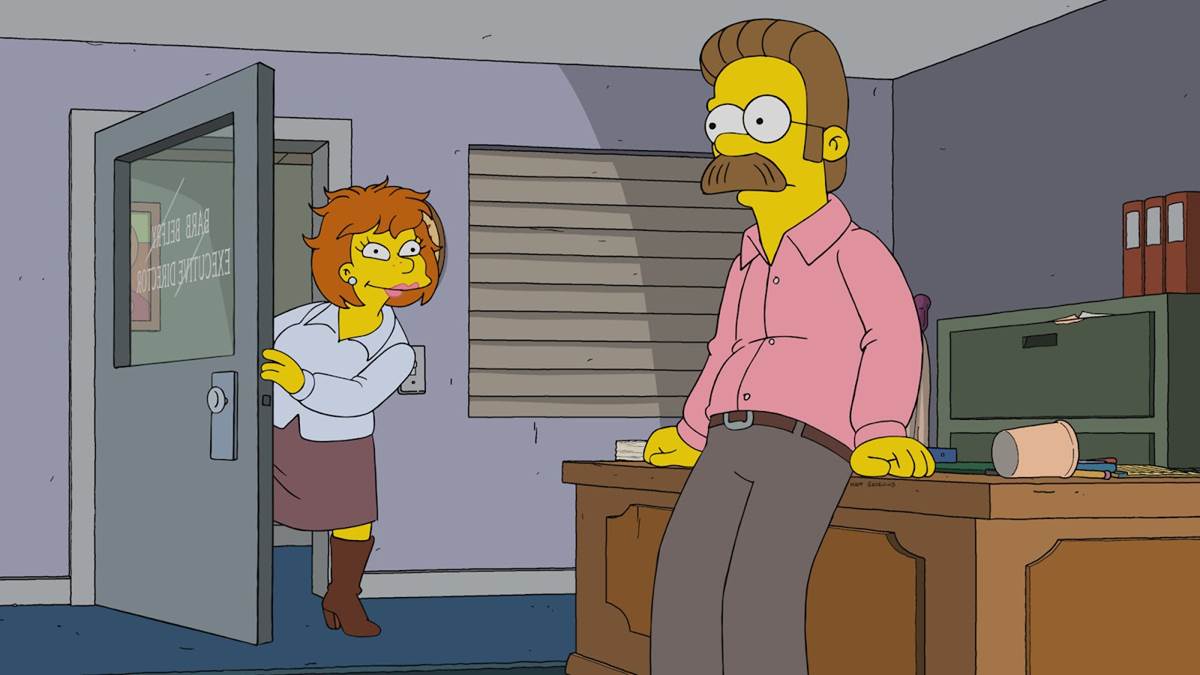 Ned Flanders breaks into the orphanage and searches frantically for the key to the safe. Barb enters and finds Ned sitting calmly at her desk. Ned says he’s in serious trouble, then spots the key hanging around Barb’s neck, so he pretends to still be interested in participating in her open marriage. We cut back to the Rich Texan’s house, where someone drags Homer out of the fire. He later opens his eyes to find Marge standing over him relieved. Ned and Barb finish making love, and Ned uses the key he swiped from Barb’s necklace to open the safe, stealing back the money and driving off. Barb realizes what happened and chases after him, throwing a flagpole through the back window of his car. “I’m sorry, God! I just want Homer Simpson to be okay,” Ned cries, just before he sees Marge and Homer driving safely in the opposite direction. Then another car comes out of nowhere and smashes into Ned’s. The Simpsons find Ned unconscious in his driver’s seat, but when Homer spots the bag of money he hesitates.