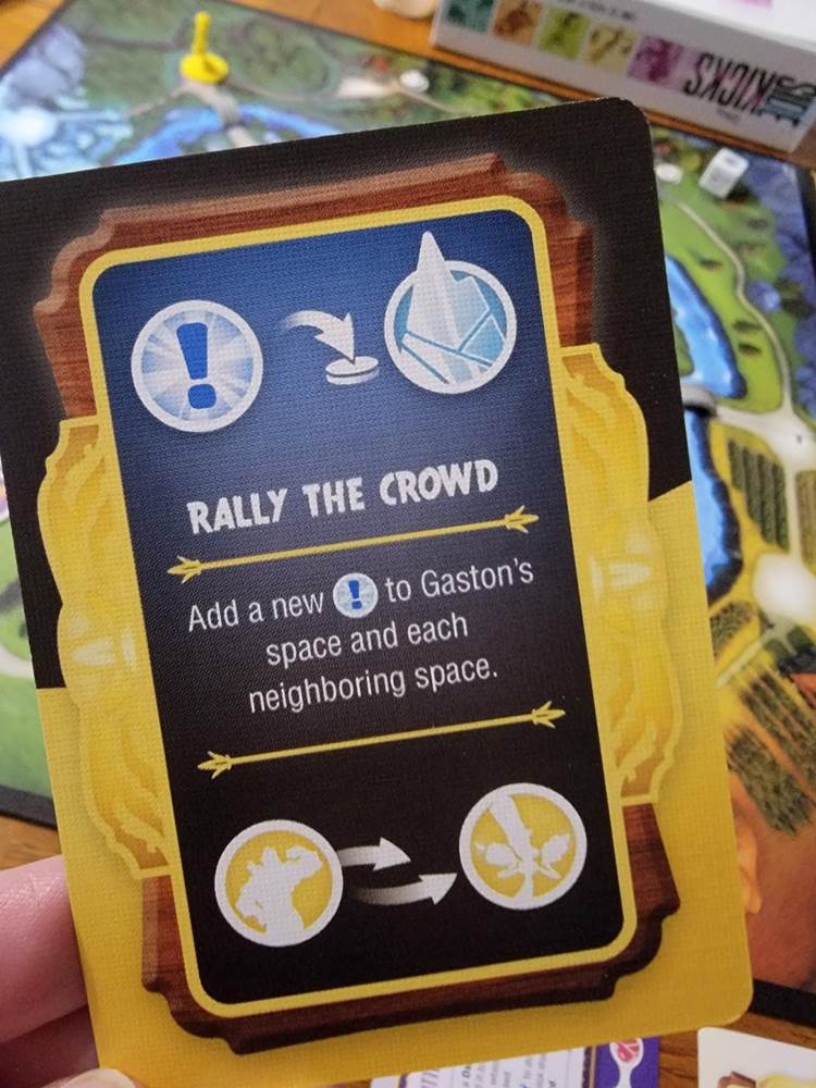 This card indicates you’ll play a Villager in the icy zone of the board, add a Villager to Gaston’s space and on either side of his piece. Then move his piece two spaces closer to Lumiere.