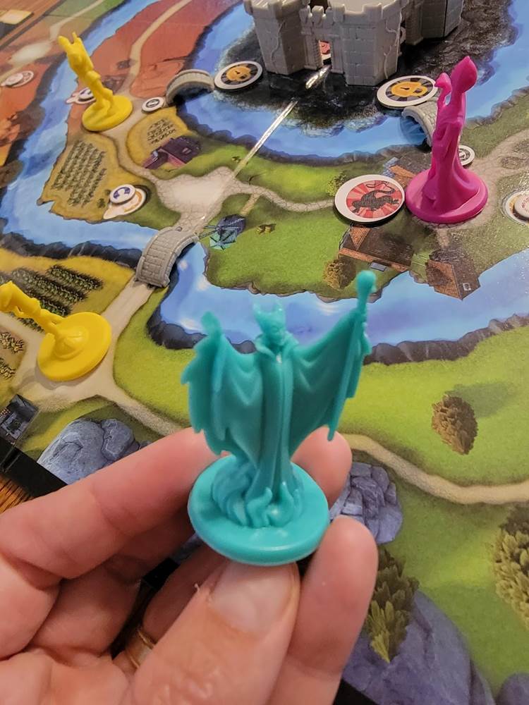 Game pieces are solid colored dimensional figures of the Sidekicks and Villains at odds. You can play as Timon & Pumbaa, Abu, Lumiere, Tinkerbell, as well as Sleeping Beauty’s three fairies, Flora, Fauna and Meriweather. Villains game pieces include Scar, Jafar, Gaston, Captain Hook and Maleficent. The heroes that are locked behind the castle walls are simple flat tokens.
