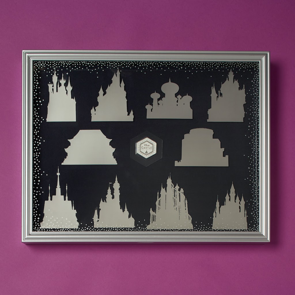 Fans collecting the monthly pin releases also had the opportunity to purchase the Disney Castle Collection shadowbox frame—perfect for displaying each of the colorful castle pins. In an elegant silver finish frame, the impressive glass case featured a magnetic lid closure, foam bed with silvery castle silhouettes, and a special cloisonné logo pin.