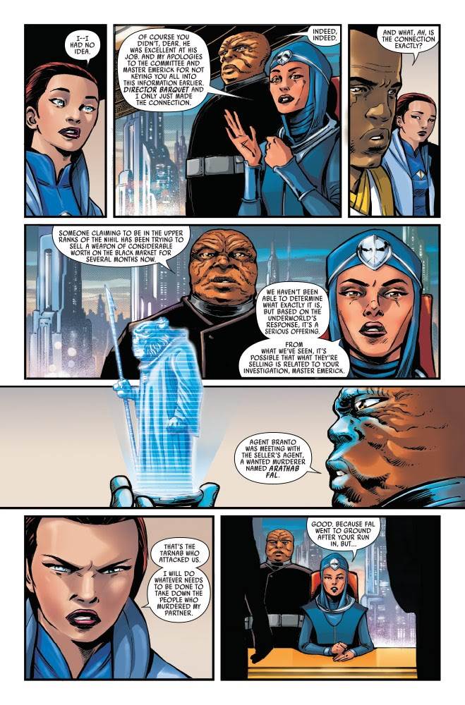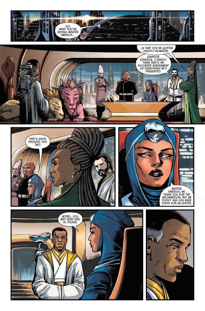 Caphtor and Holt are partnered together by the Republic’s Supreme Chancellor Lina Soh (almost acting in the police chief role for this Star Wars detective noir story) and dispatched to the underworld planet of Vorzyd V, also known as the Gambler’s Paradise– another location borrowed from the no-longer-canon Legends continuity. There, an undercover agent working for the Republic has made contact with a wanted criminal named Arathab Fal, though that meeting has– unbeknownst to our protagonists– ended with another murder mystery waiting to be solved. We get some good character-building moments between Emerick and Sian on their way to Vorzyd V, and a couple fun action sequences in dimly lit rooms and dark alleys when Fal enters into cutthroat conflict with the ruthless band of marauders known as the Nihil. The investigators follow some twists and turns in their case, and the issue ends on a cliffhanger that promises more intrigue to come next month.