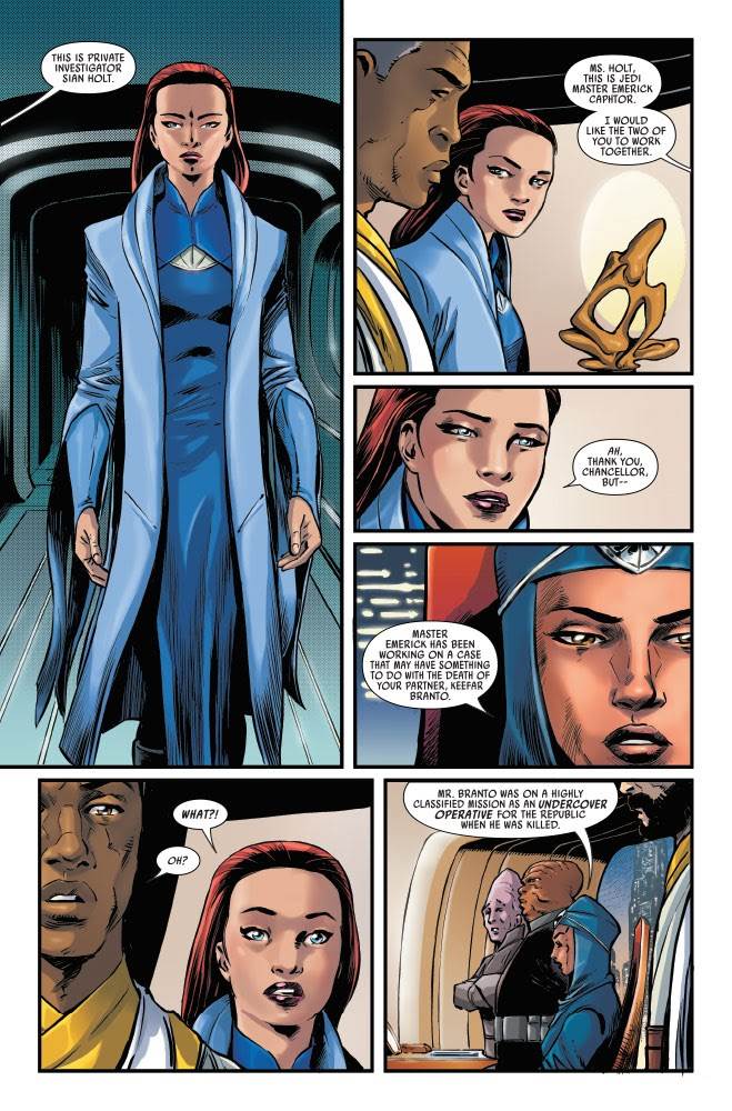 Star Wars: The High Republic - Trail of Shadows #2 picks up where the previous installment left off, with Jedi investigator Emerick Caphtor flummoxed by his inquest into the death of Master Loden Greatstorm (as depicted in author Cavan Scott’s novel The Rising Storm), and private detective Sian Holt left with a case of post-traumatic depression after the death of her partner.