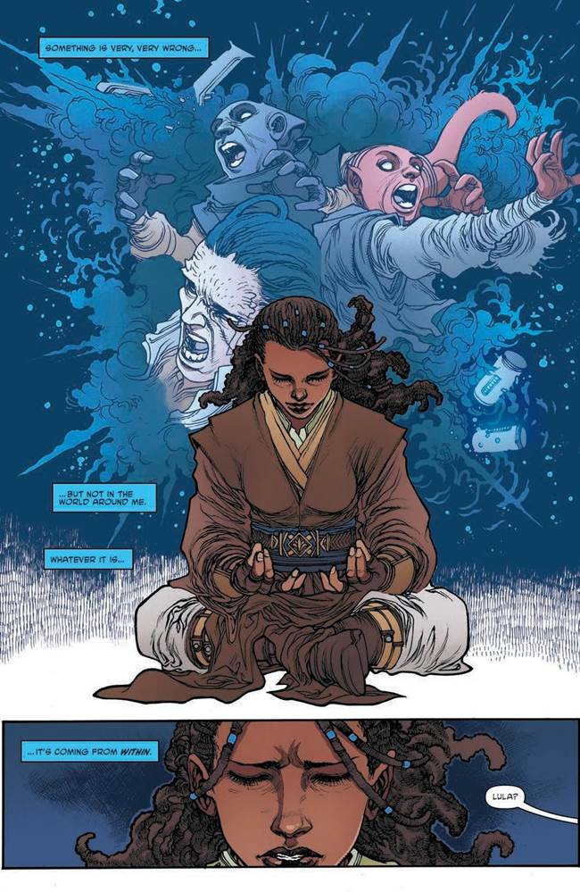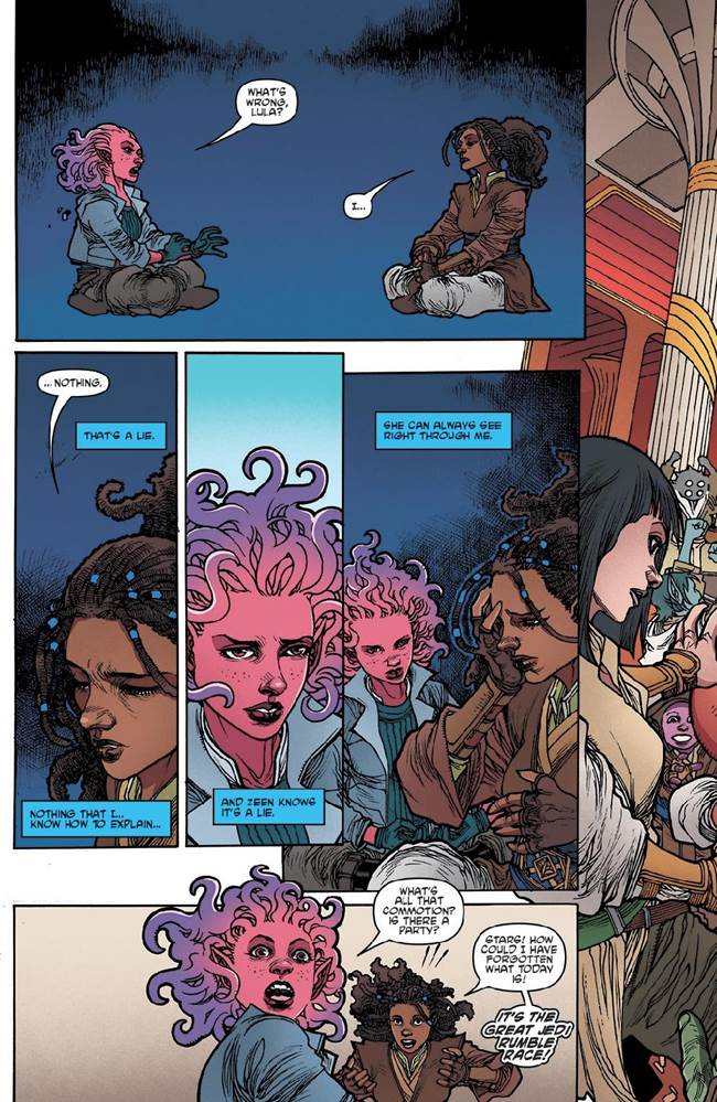 In The High Republic Adventures #11 begins with Jedi Padawan Lula Talisola meditating on the recent events in her life and the disquiet growing inside her, until she is interrupted by her friend Zeen Mrala and the news that the infamous race is about to begin.