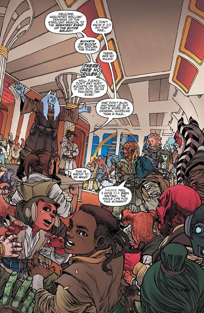 There isn’t a tremendous amount of in-universe history given for the Great Jedi Rumble Race, except for the fact that Jedi Master Torban “Buckets of Blood” Buck is undoubtedly the one most excited for it among the dozens of Jedi stationed on Starlight Beacon, up to and including the young Padawans. “There are no rules!” exclaims Buck, just before he sends all manner of Jedi careening through the halls of the station, whether running, jumping, or– in the case of Ram Jomaram– riding on modified droids. Meanwhile, we check in with Zeen’s childhood friend Krix Kamerat, now a bigwig among the ruthless band of marauders known as the Nihil, who is on Corellia planning the barbarous group’s next big move against the Jedi. Krix negotiates the details of the scheme with a being called Respriler and his cohort Sabata, both of whom start plotting Kamerat’s downfall as soon as he’s out of earshot. It seems working among the Nihil is a dangerous proposition, even after you’ve managed to gain a foothold of respect in the organization.