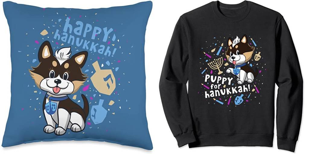 - The designs showcase a cartoon puppy, dredels, confetti, a menorah and read “Happy Hanukkah” or “Puppy for Hanukkah.” Items are priced between $21.99-$39.99.