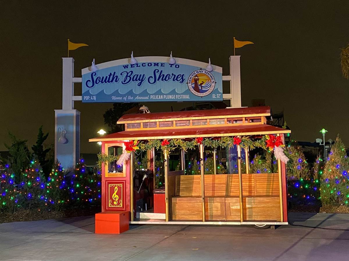 Another performance location is this fun trolley, parked in front of the closed entrance to the new South Bay Shores water park.