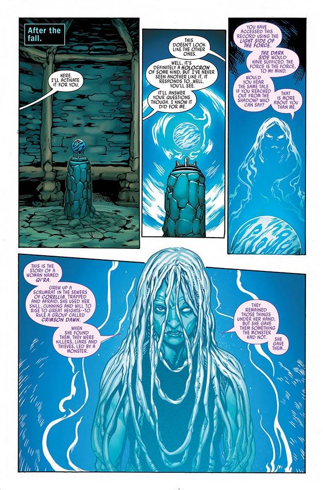 Crimson Reign #1 begins with a flash-forward to sometime “after the fall”-- the fall of what isn’t revealed until the end of this issue, so I won’t spoil that here– where a holocron recording of a haggard woman who calls herself “the Archivist” tells the history of how Qi’ra began to use Crimson Dawn’s influence to further her quest to destroy the Sith once and for all. In pursuit of this goal, Qi’ra has assembled a deadly collection of individuals and groups who have felt themselves wronged by the Sith Order in the past: the Knights of Ren, Chanath Cha and the Orphans, Deathstick, and Ochi of Bestoon, among others. These gangs and assassins are ordered to bring chaos to the galaxy’s underworld, setting other criminal syndicates like the Black Sun and Pykes against each other by planting seeds of doubt and suspicion among their ranks. It’s exciting to note that this story gives us the first narrative mention of Black Sun’s leader Prince Xizor in the current canon (see the Legends-continuity novel Star Wars: Shadows of the Empire for more information on him), but there’s also a lot more going on in that we are introduced to a number of new characters and factions, all of whom are either working for Crimson Dawn or eventually fall victim to Qi’ra’s machinations.