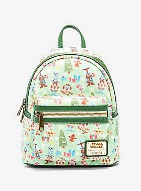 Box Lunch is offering a Loungefly mini backpack with Star Wars The Mandalorian Chibi all over print with images of IG-11 carrying a tray of Jawa gingerbread cookies along with Mando and Kuill enjoying the holiday treats and other HAPPY holiday fun.
