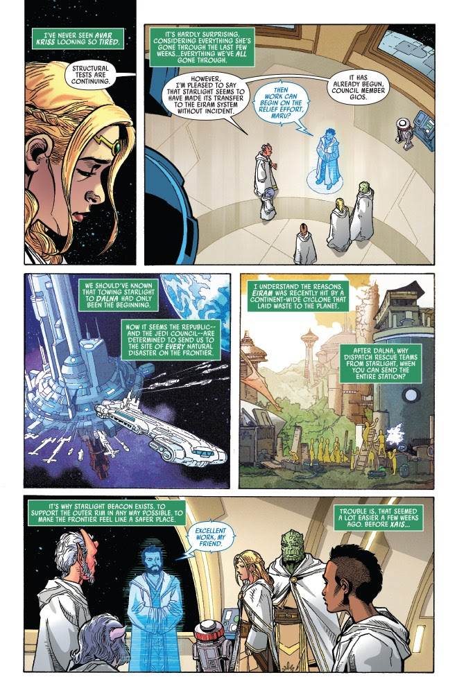 The cliffhanger of last month’s issue of the excellent Star Wars: The High Republic from Marvel Comics is resolved in today’s release, but not quite in the way I had expected. Instead, Chapter 2 of the “Jedi’s End” arc– entitled “The Spirit of Disunity”-- immediately cuts to some time later, with the devastated Jedi Master Avar Kriss attending a briefing on the Starlight Beacon space station. Through flashbacks, we learn what happened on the planet Xais after Nihil Tempest Runner Lourna Dee made her unlikely escape.