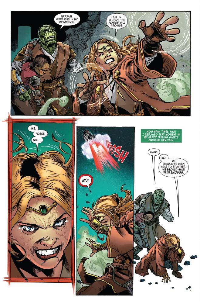 Avar wants to respond with an aggressive counterattack on the Nihil base, though her friend Stellan Gios on the Jedi Council advises patience and caution before she goes on the offensive. Trennis wallows in her own sense of misguided self-pity, blaming herself for the events on Xais until she’s approached by Master Maru, who asks her to watch over Kriss on the mission. Sskeer, meanwhile, has been stripped of his lightsaber and awaits judgment by the council due to his failure to disclose a debilitating Trandoshan brain disorder he’s seemingly contracted, though he’s forced to make a difficult decision when Keeve comes to him for help with the task at hand. It all builds to the three Jedi departing Starlight Beacon for the fortified Nihil base known as the Great Hall, located in a clandestine area of the galaxy referred to only as No-Space. This is definitely a place-setting issue, foregoing action in favor of character development and setting the stage for battles to come, but that just so happens to be my favorite kind of Star Wars story, so Scott (who serves as writer here, too) won’t be hearing any complaints about it from me.