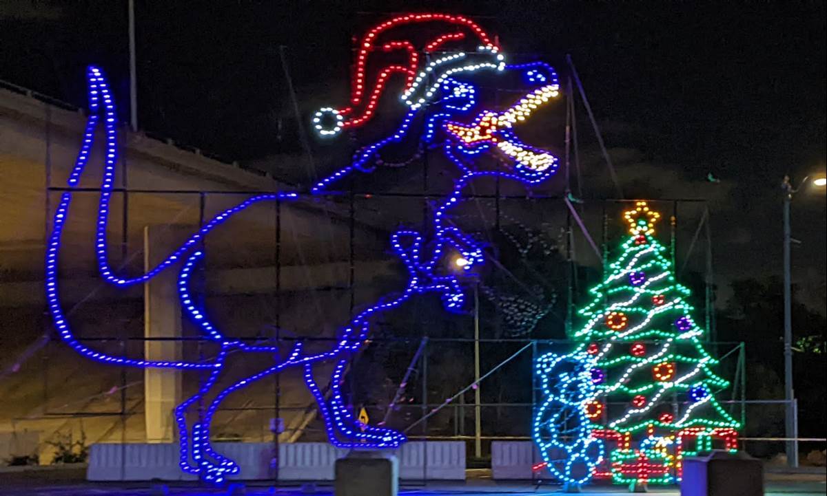 Themed areas include a Candy Cane Lane, a tropical Christmas, landmarks and holidays from around the world, “The 12 Days of Christmas,” the Toy Factory, the Nativity, a field of snowflakes, “Prehistoric Christmas” (which was probably my favorite overall, because who doesn’t love the ideas of dinosaurs celebrating Christmas?), and “‘Twas the Night Before Christmas.” There are also attractive light displays dedicated to the Bigfoot monster truck and the Angels baseball team itself, of course.