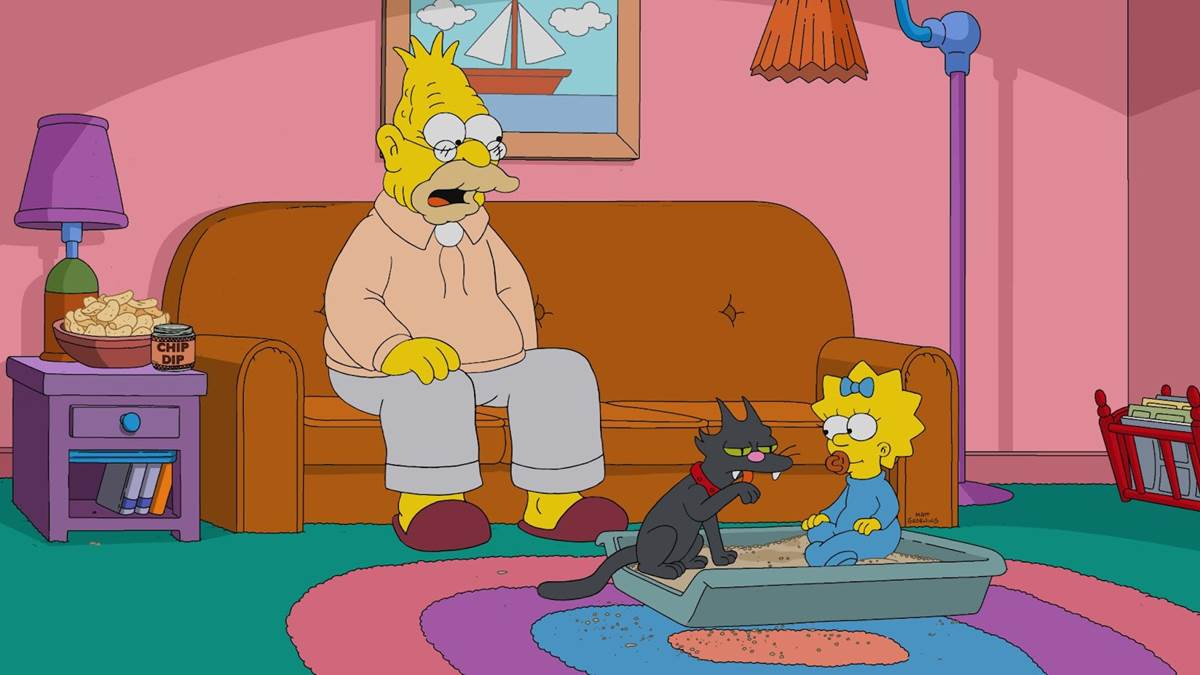 After being connected through an old-fashioned telephone operator, Abe tells Marge that “everything is A-Okay!” but Maggie is playing in the litter box with the family cat Snowball. Thinking he is outside at the beach, Grampa starts to put on what he believes to be sunscreen, but it’s really chip dip. Back at the park, the Simpsons board a ride called Cauldrons of Chaos (basically Disneyland’s Mad Tea Party) and Homer thinks he can use the attraction as an opportunity to relax until Bart starts spinning the ride out of control. Bart refuses to stop unless Homer agrees to buy the kids something at the gift shop, and Homer hits the emergency stop button, which dumps the family down an exit chute right into… well, the gift shop. Bart and Lisa select numerous wands, which makes Homer grumble as he opens his wallet, and then they head home. Arriving back at the house, they find Grampa swaddling the cat, who is sucking on Maggie’s pacifier.