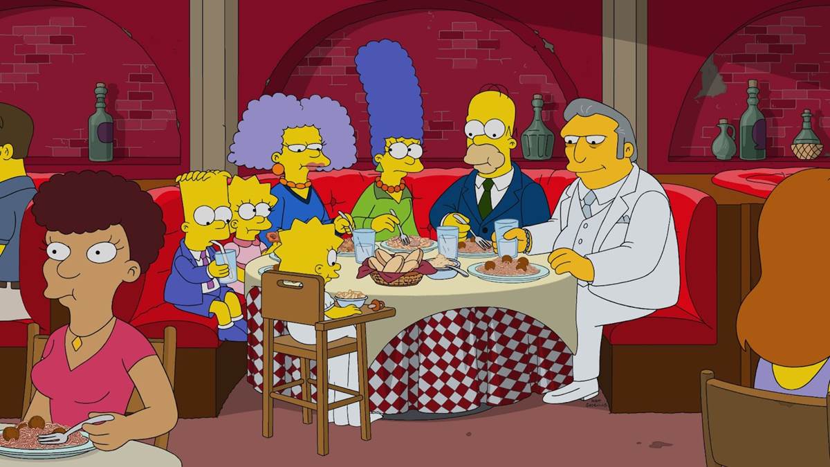Out to dinner at Luigi’s, Marge tells herself just to get through the evening because “you never see the godparents again.” Fat Tony says he takes the responsibilities of being a godfather seriously “and almost intrusive.” He presents Maggie with a First Communion book his mother gave him along with his first ten-dollar bill, which blows out of the book and burns up on the tabletop candle, causing Fat Tony to break down in tears. Fat Tony is further incensed when Lisa informs him about the differences between Catholicism and Protestantism, and he gives Maggie a statue of “the Saint of Learning to Speak,” which she begins sucking on like a pacifier. “You gotta love a religion with merch,” says Bart. Marge tells Homer that Fat Tony being godfather might actually work out, and on the way the family keeps stopping the new car so they can play with its automatic gull-wing doors.