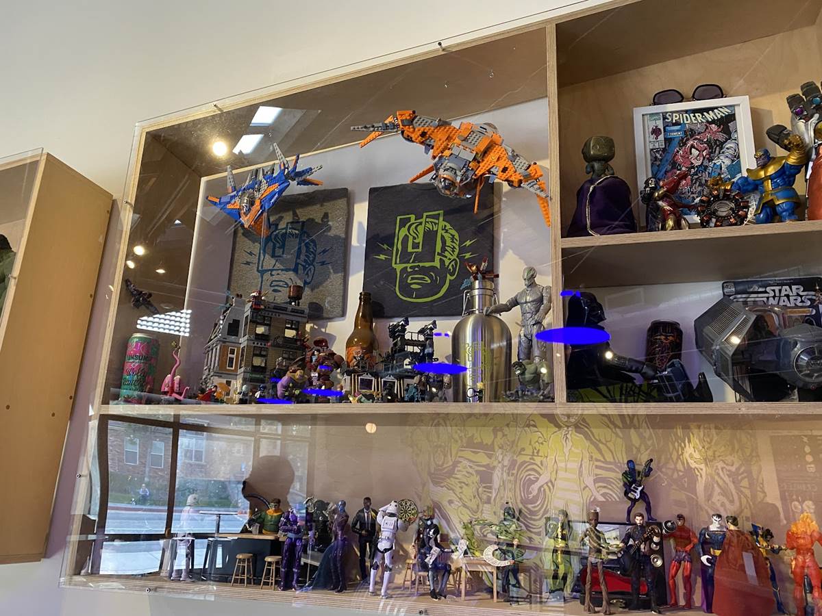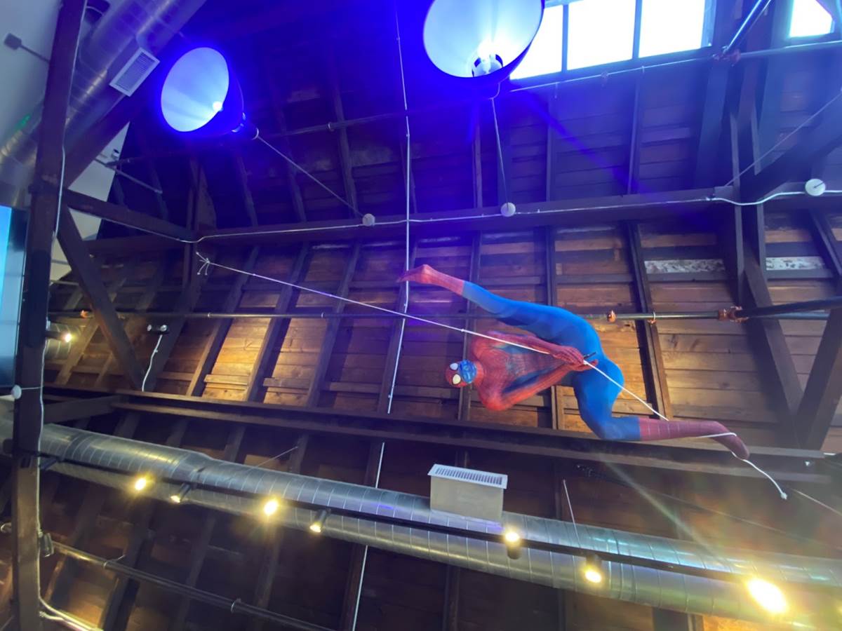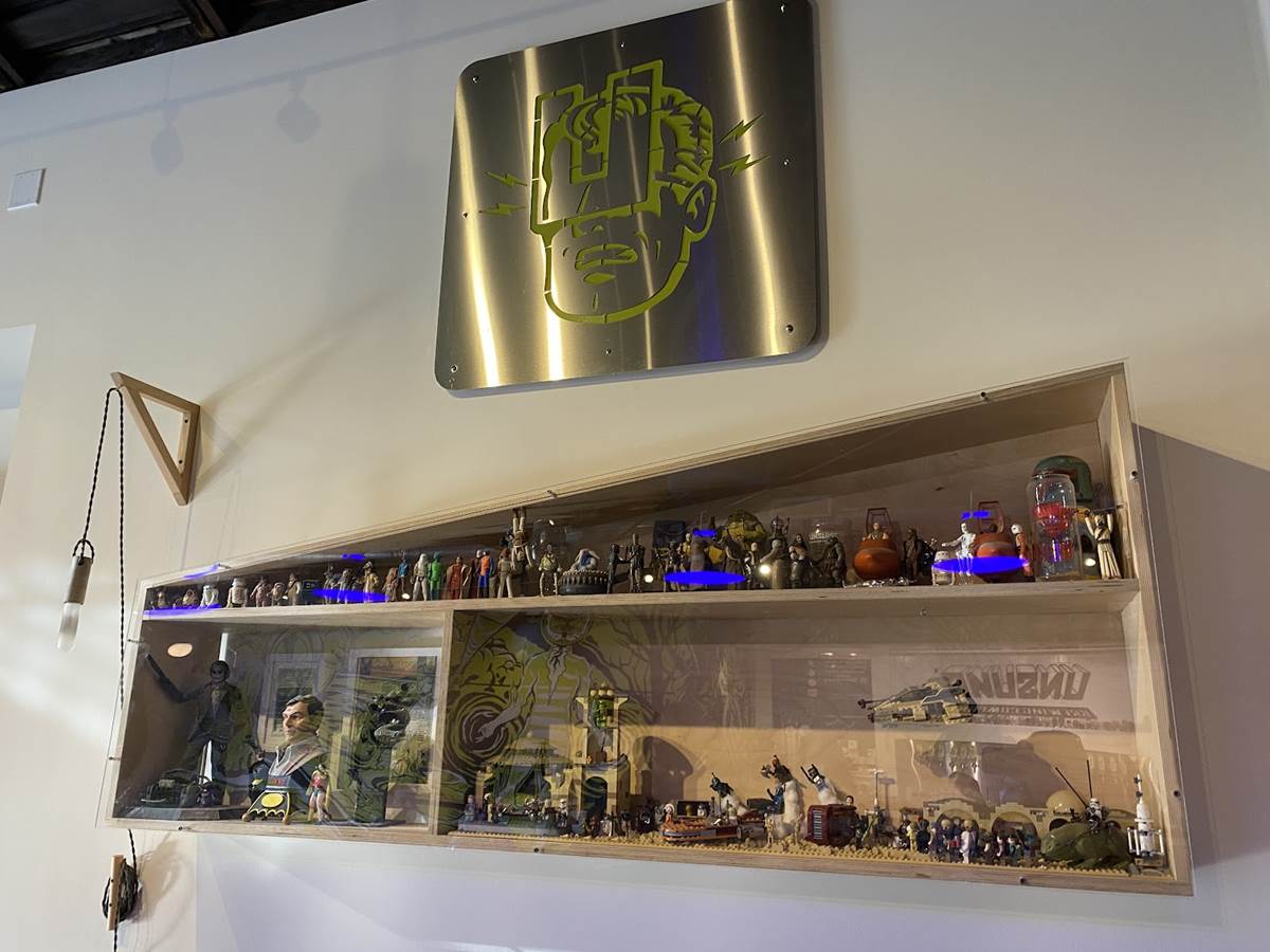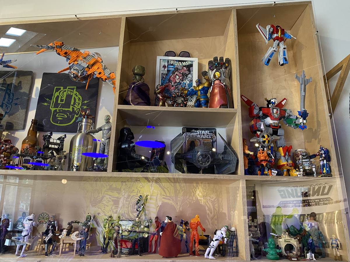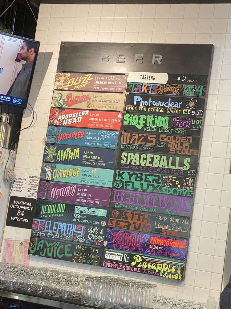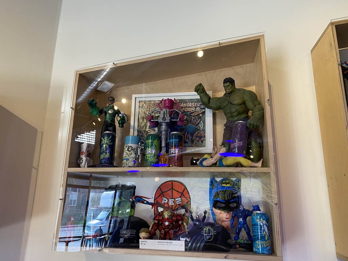 The decor around you in the tasting room is actually curated by fans and collectors who generously share their items and collectibles. While there are some Star Wars items surrounding you, the bulk of the items fall into the Marvel category, keeping up the superhero idea. Yeah there’s some DC around too, but when you look up and see the life sized Spider-Man swinging through the rafters, it’s hard to acknowledge anything else.