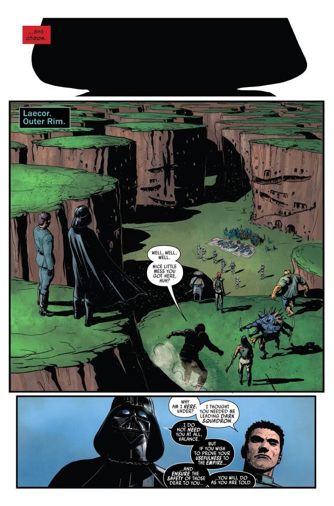 Then we smash cut to the “present” of this ongoing comic book (currently the period between the events of The Empire Strikes Back and Return of the Jedi), where Darth Vader and his new recruits– “revengers” who have been wronged by the Crimson Dawn crime syndicate in the past– have traveled to the Outer Rim planet of Laecor. There, they investigate a Crimson Dawn attack on civilians who were once loyal to a local Jedi protector. Naturally, after Vader takes out a squadron of double-agent stormtroopers, the residents of Laecor come to think of him as their new savior, but as former bounty hunter– and now Vader’s begrudging third-in-command– Beilert Valance warns his troops, the Dark Lord only serves the interests of the Galactic Empire. Meanwhile, Ochi of Bestoon continues to operate as Vader’s right-hand man, though shockingly the fearsome Sith has not yet figured out that Ochi is indeed also an agent of Crimson Dawn, as revealed near the end of this year’s Star Wars: War of the Bounty Hunters crossover event.