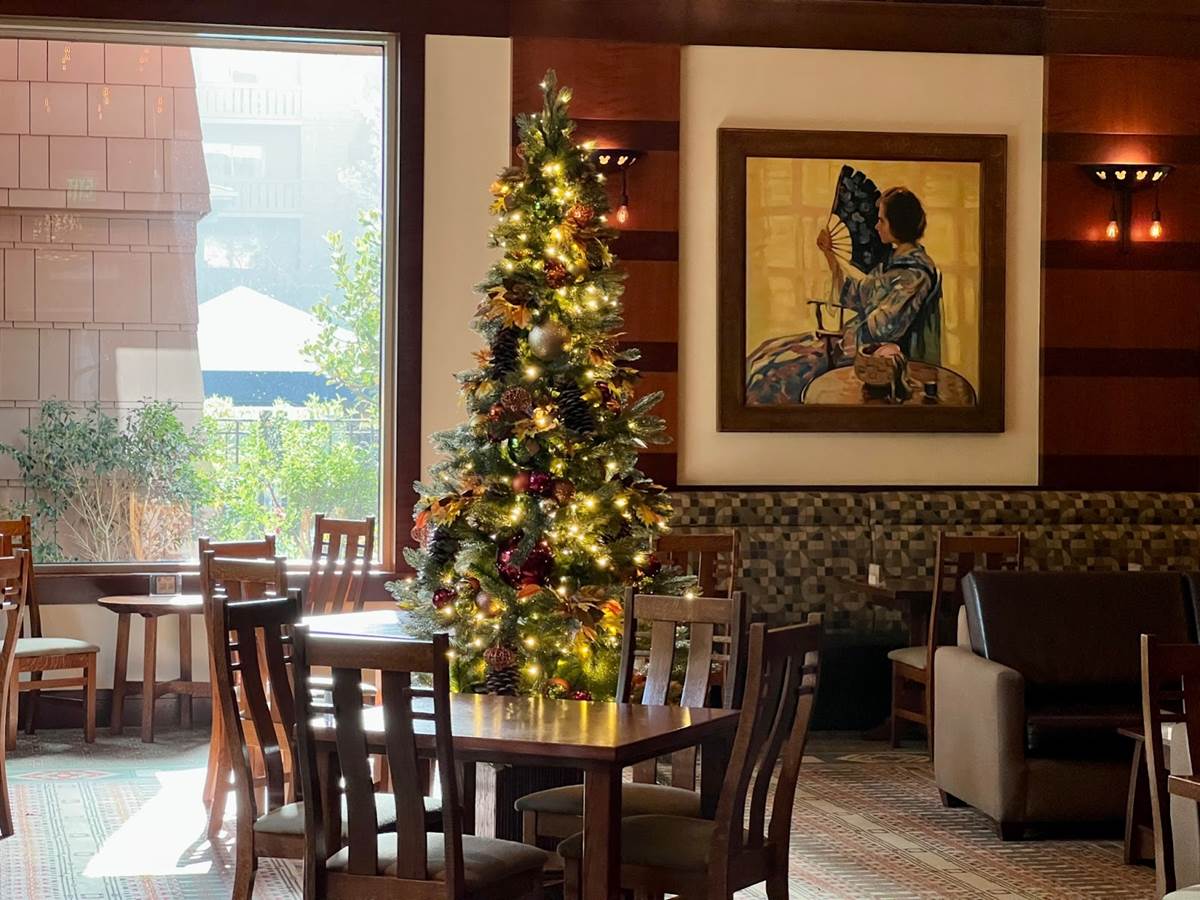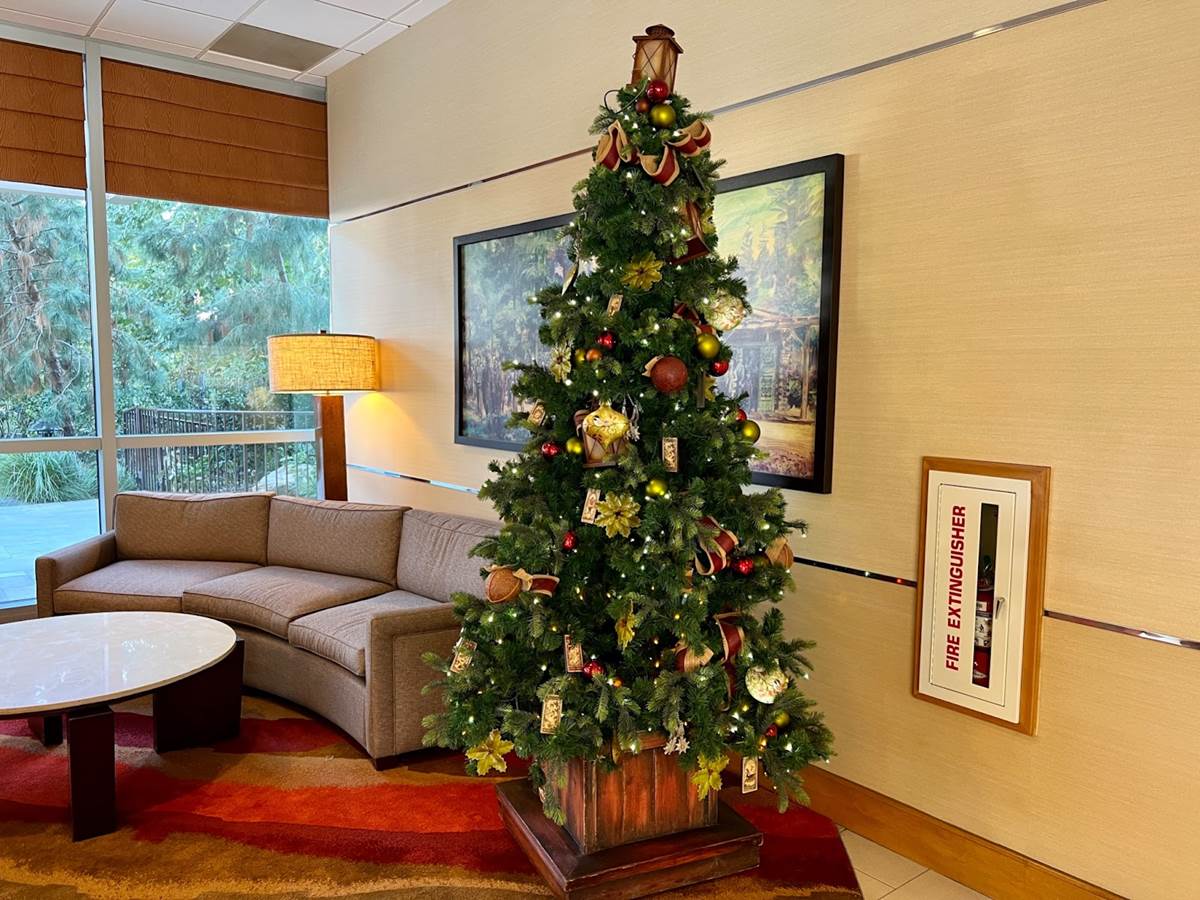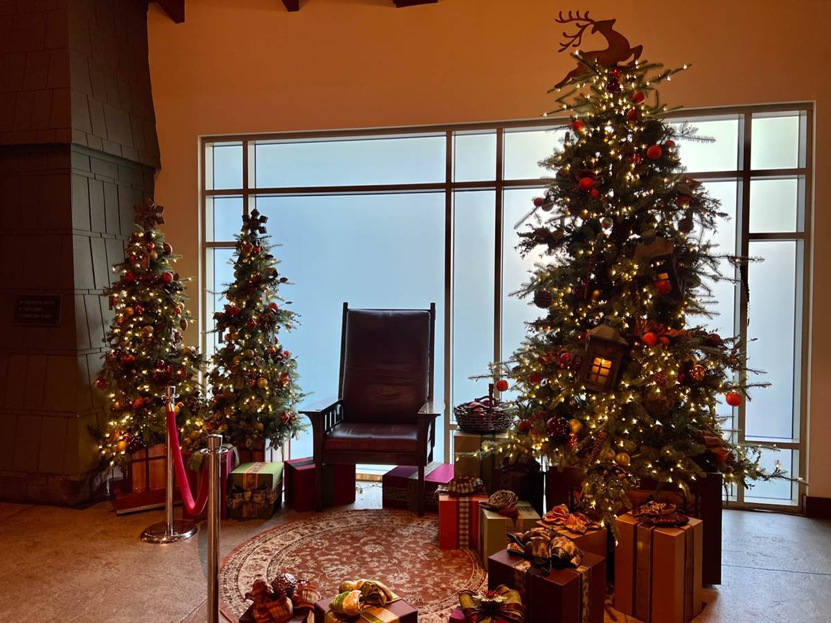 The main tree in the lobby is just stunning and if you are lucky enough to grab a rocking chair next to the fire place with a view of the tree you would almost swear you are in Northern California with snow falling outside and coming from the kitchen the sweet smell of turkey and yams.