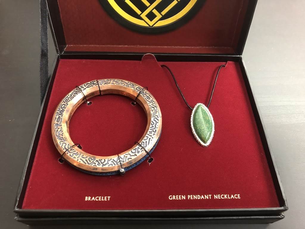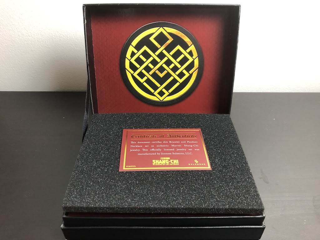 The Shang-Chi Necklace and Bracelet Ring set includes a pendant necklace and replica bracelet packaged in a keepsake display box. It costs $89.99 and qualifies for free standard shipping in the U.S. Upon getting the box I was very pleased with the feel and weight of it and how the contents inside were packaged with small twist ties and foam sheets to prevent movement and scratching.
