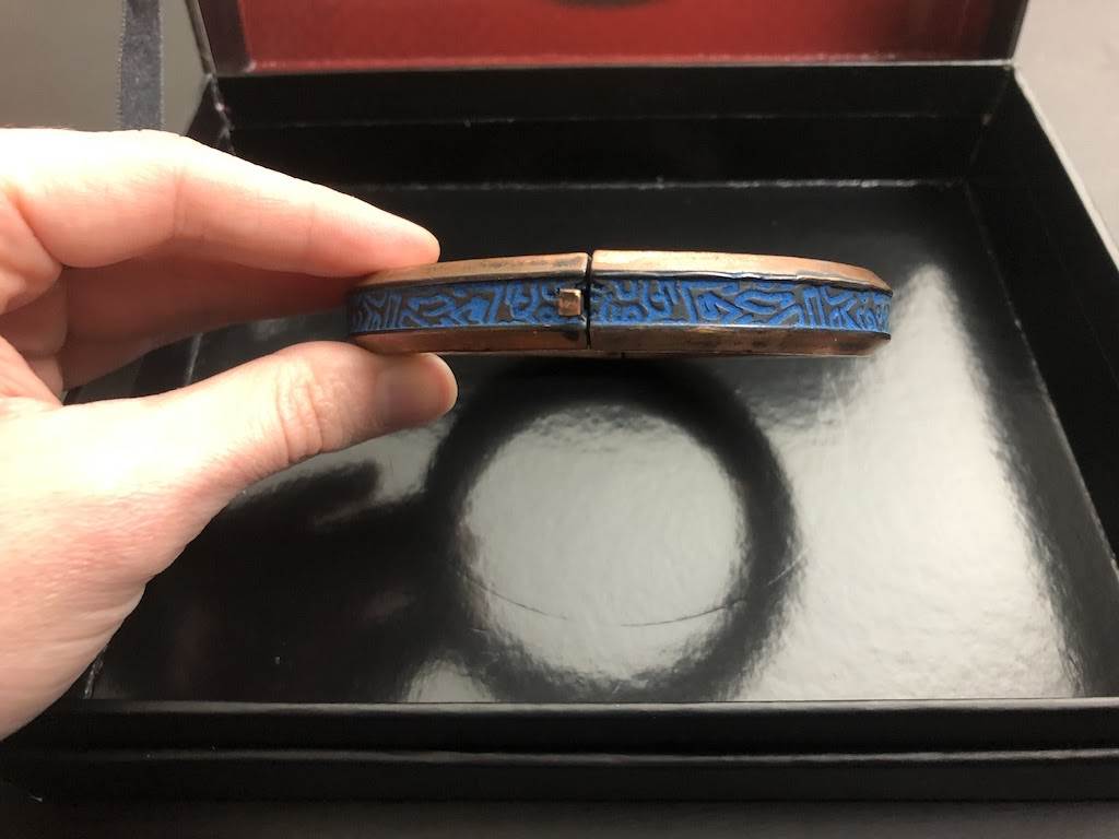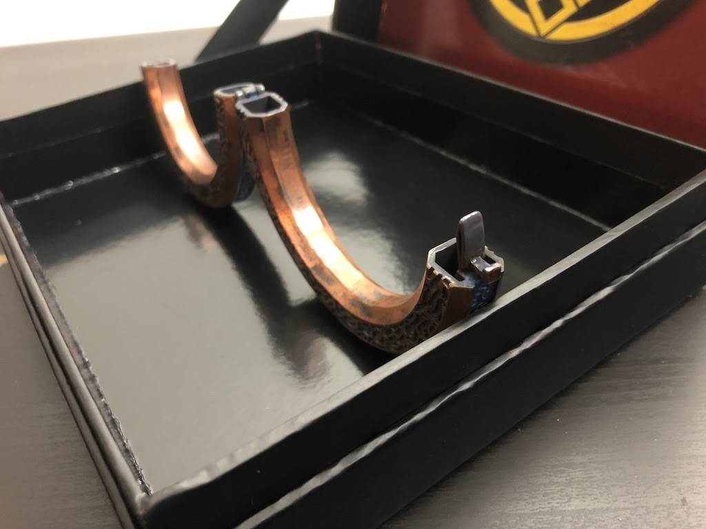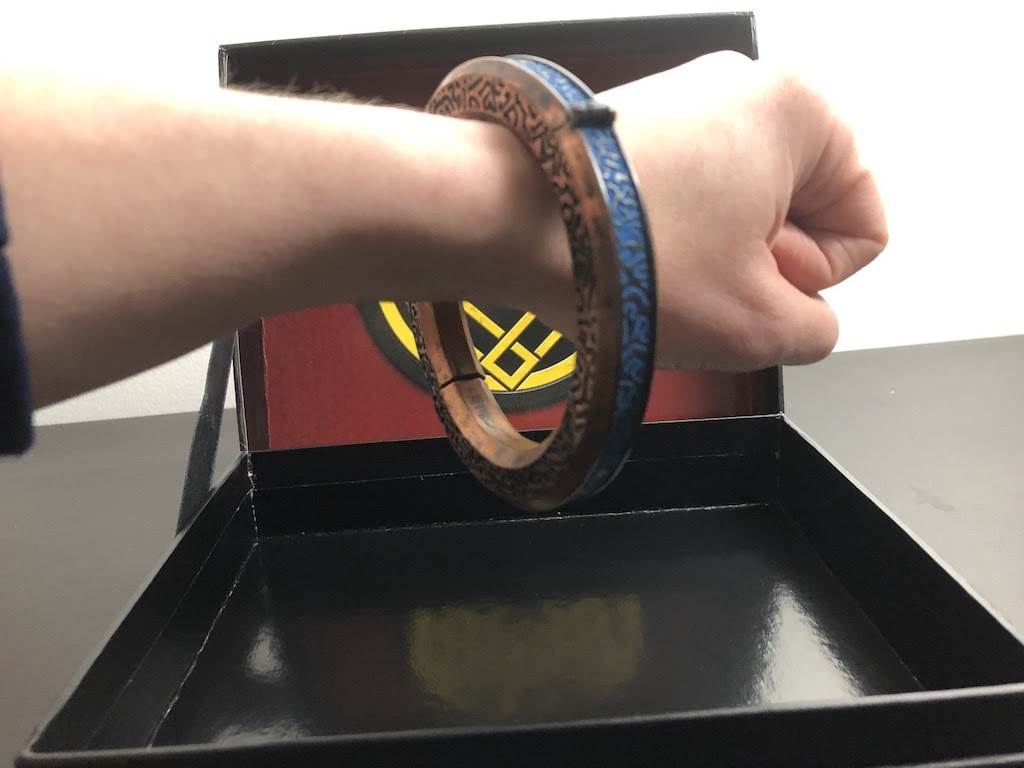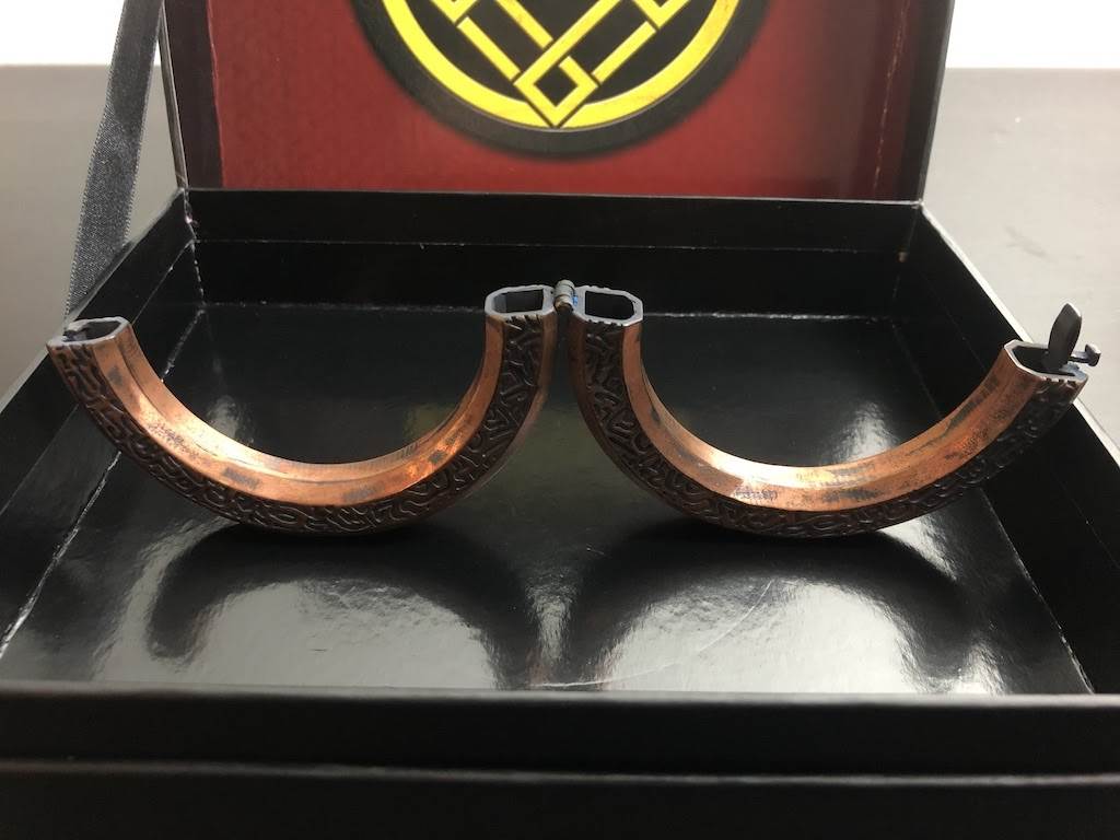 Now onto the bracelet. This is a rather large replica bracelet made of brass that features the Ten Rings markings on all exterior sides. The side of the bracelet has blue markings that glow in the dark to better resemble the activated power of the unique weapon. The bracelet is sturdy and has no give, but it does open in half with a clasp on one end and hinge on the other—kind of like a clamshell.
