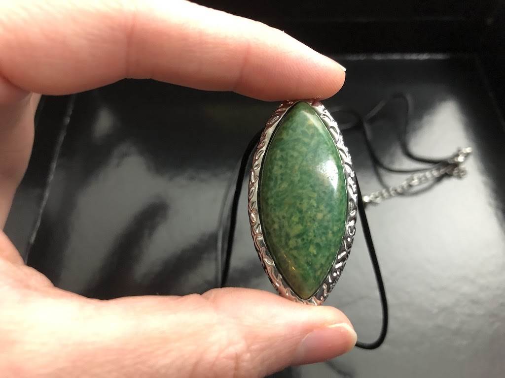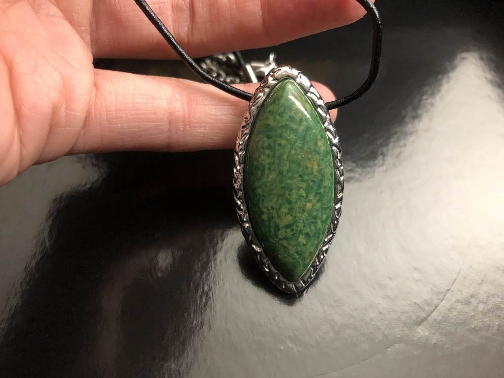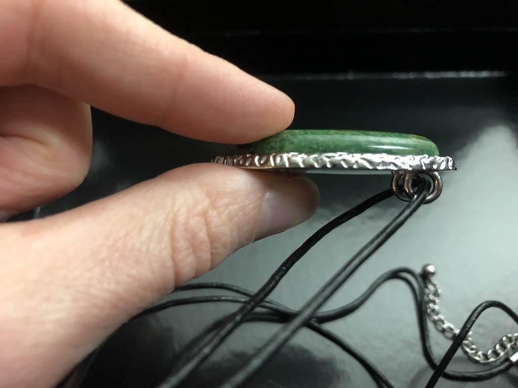 My one criticism is of the cord that has some slight creasing from where it was folded, but I’m hopeful that those will soften with wear. And if you’re using it just for display it doesn’t really matter anyway. While there’s a clasp on the back and an extender to fit various size necks or display better against clothing, I was able to slip the whole thing gently over my head without undoing the necklace.