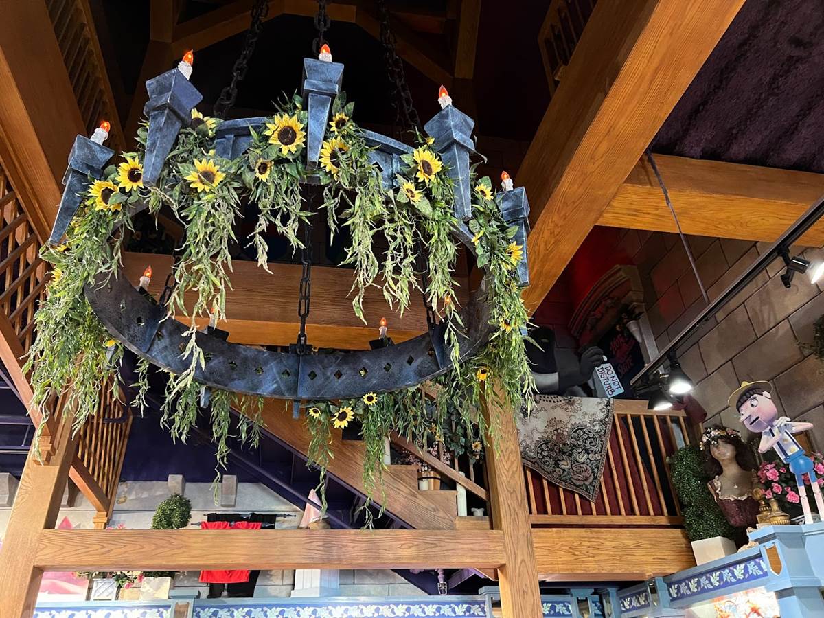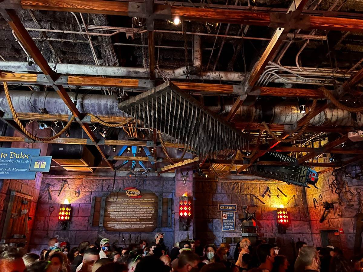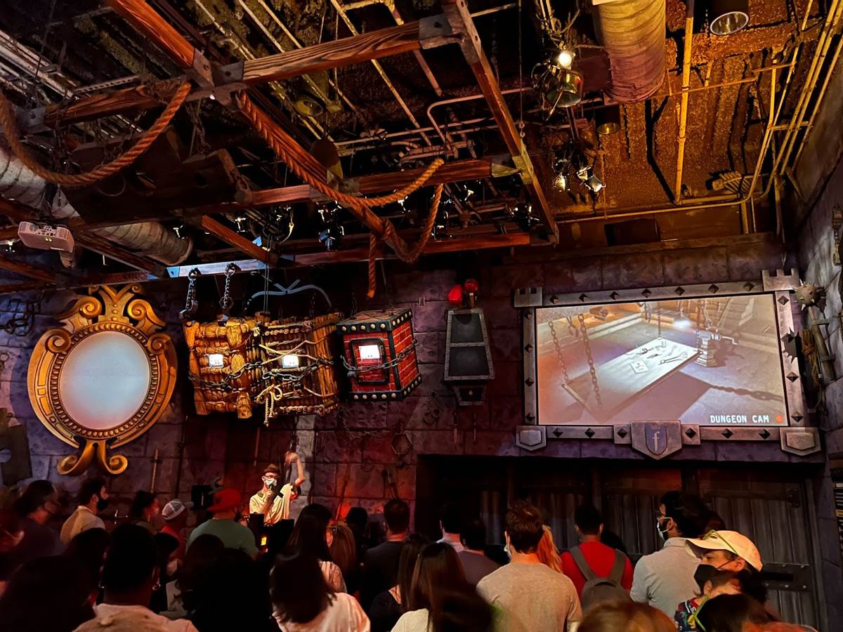 The preshow takes place in Lord Farquaad’s dungeon where he has captured several characters, including Pinocchio, the three little pigs, and the Magic Mirror.