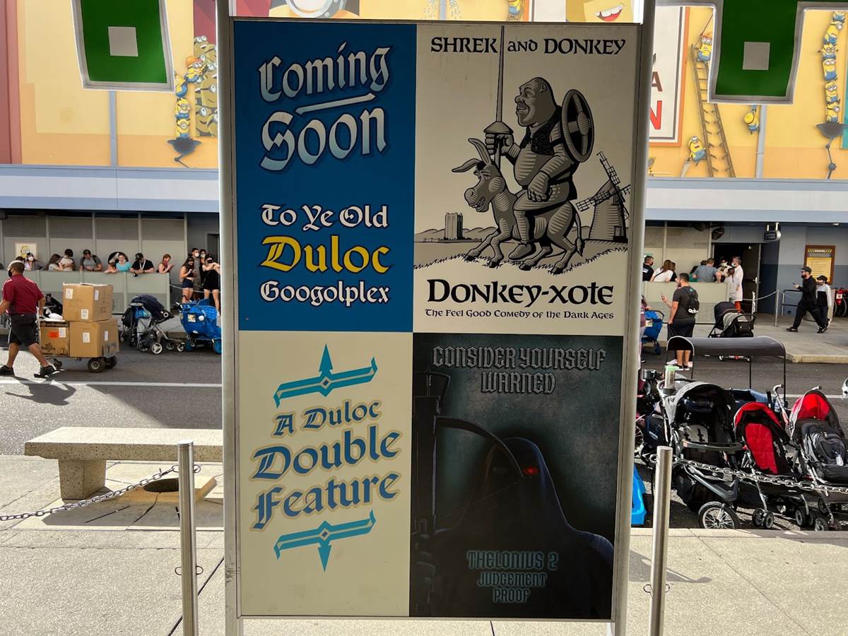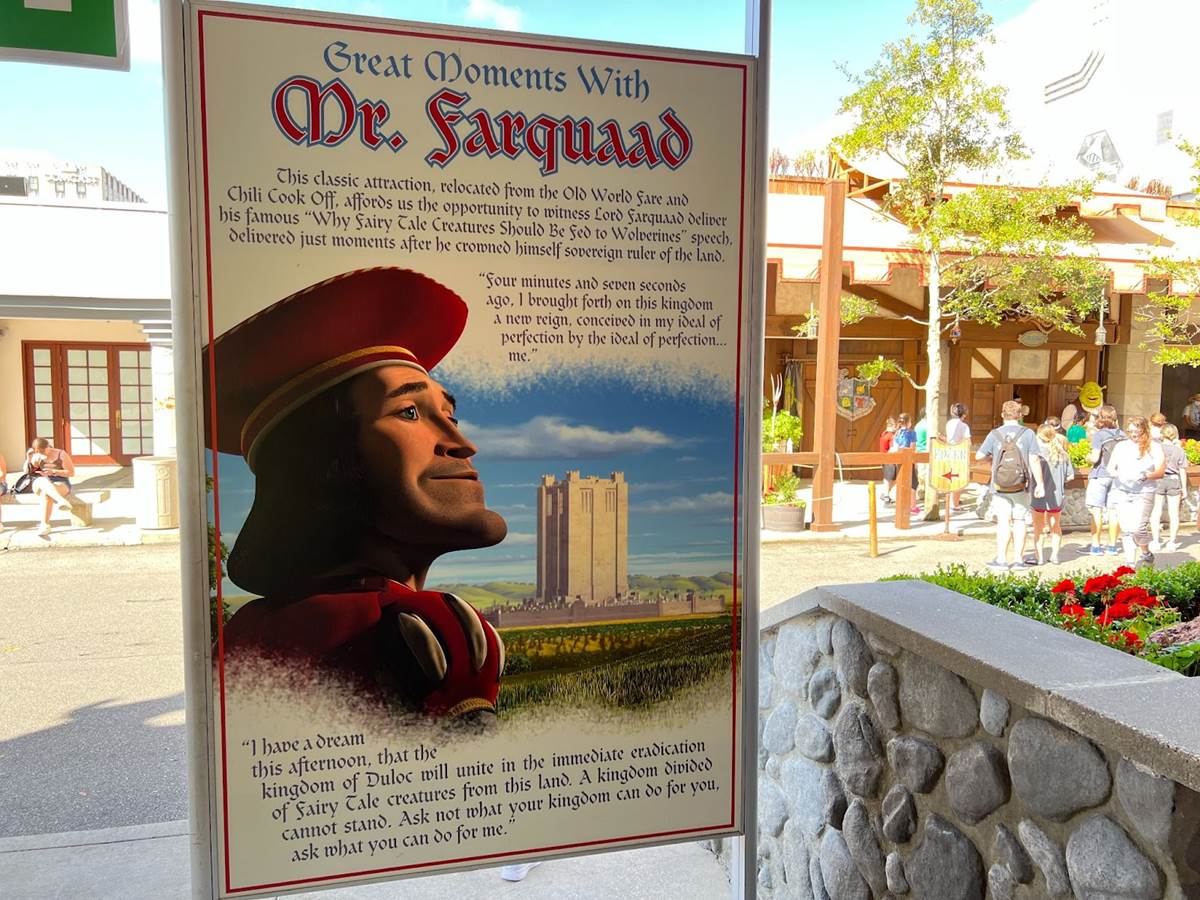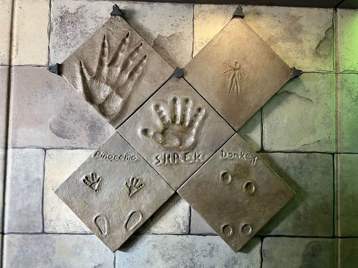 In case you forgot that you are in a Hollywood movie studio, hand, hoof, and talon prints in cement might remind you that Duloc has gone Hollywood for this immersive moviegoing experience.