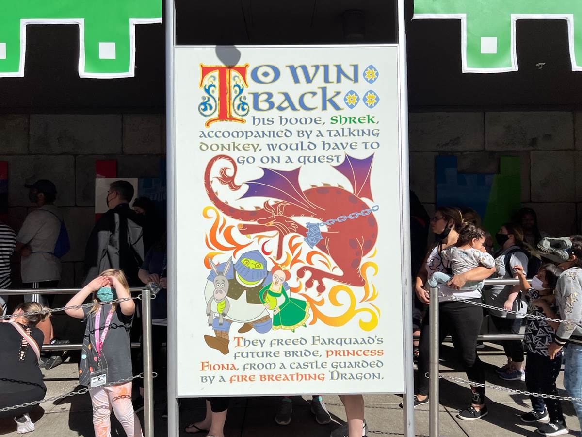 Before thou enters the queue, pages from a storybook recount the tale of our valiant hero Shrek and his noble steed Donkey who rescued the fair Princess Fiona, who found her true love in the green arms of the ogre that saved her. But an addendum has been made by the ghost of the fearsome Lord Farquaad, who is now out for vengeance!