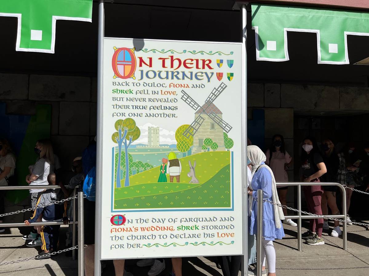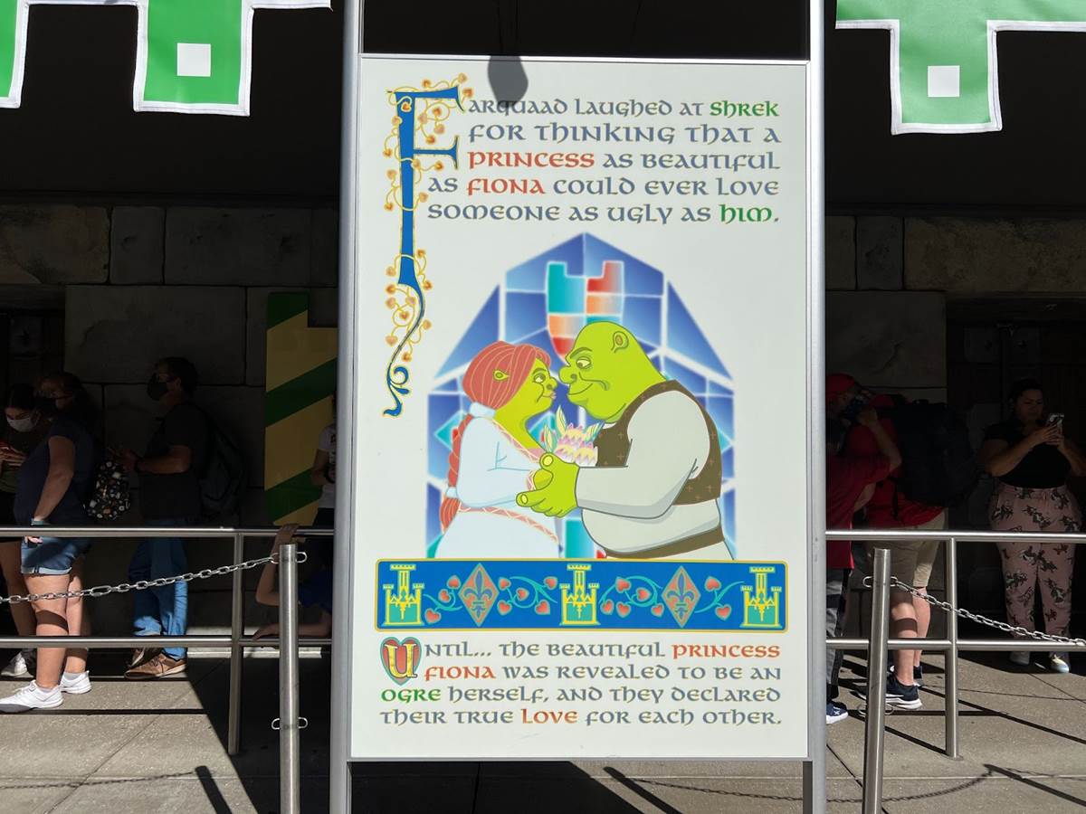 A highlight of the queue for Disney fans could be found on the backside of these pages, homages to classic Disneyland attractions with Shrek characters.
