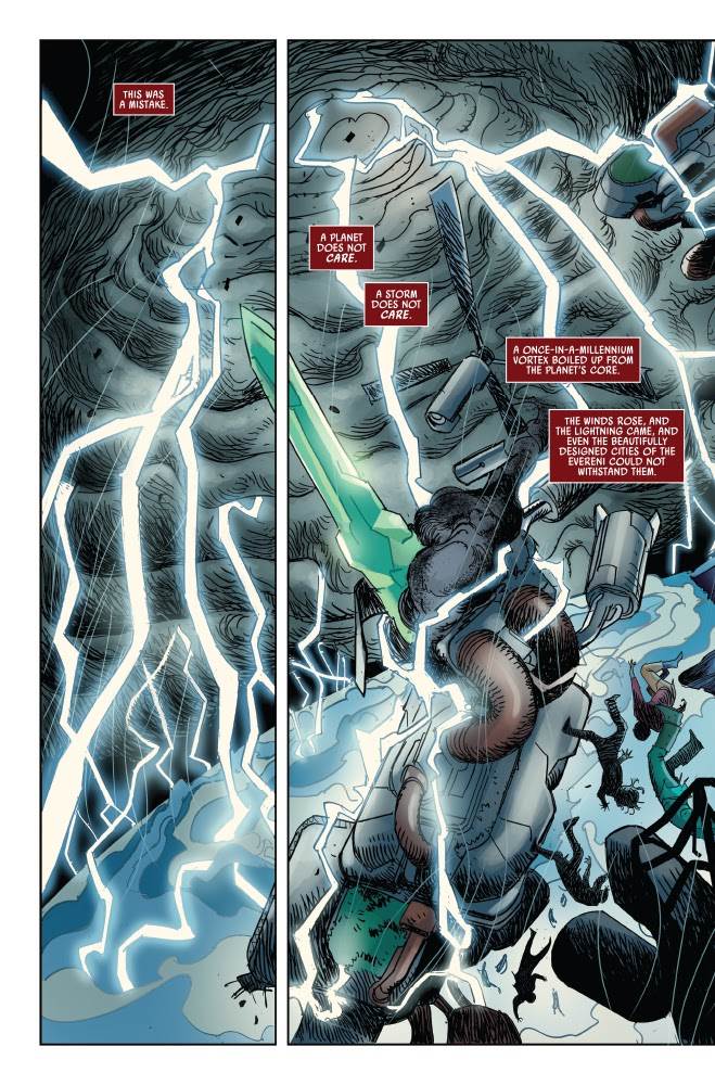 Eye of the Storm #1, written by Charles Soule (Star Wars: The High Republic - Light of the Jedi) and illustrated with moody atmosphere by Guillermo Sanna (Darkhold: Iron Man), opens with Marchion Ro addressing the reader in a way that immediately calls to mind Soule’s other current Marvel Comics miniseries, Star Wars: Crimson Reign. A text box tells us this bookend takes place “After the Fall,” and Marchion Ro introduces the story that brings us back to the origins of the Nihil as a species called the Evereni whose storm-ravaged homeworld eventually inspired the naming for the group’s tiered structure. Desperate for resources, the Evereni fight among themselves for centuries before venturing out into the galaxy and discovering there are other worlds and species to poach from. Thus the Nihil are born, and many years later we are introduced to Marchion’s father Asgar Ro and grandmother Shalla– who I’m now guessing will likely be the Jedi Order’s chief antagonist when The High Republic rewinds time 150 years for its upcoming second phase beginning this fall.