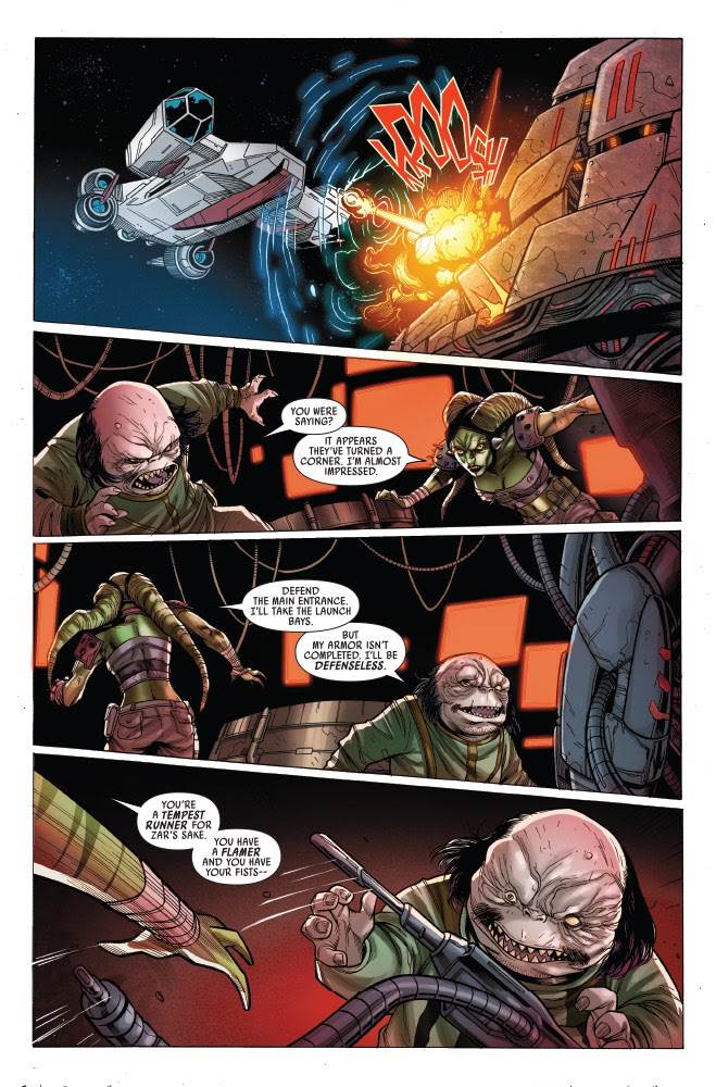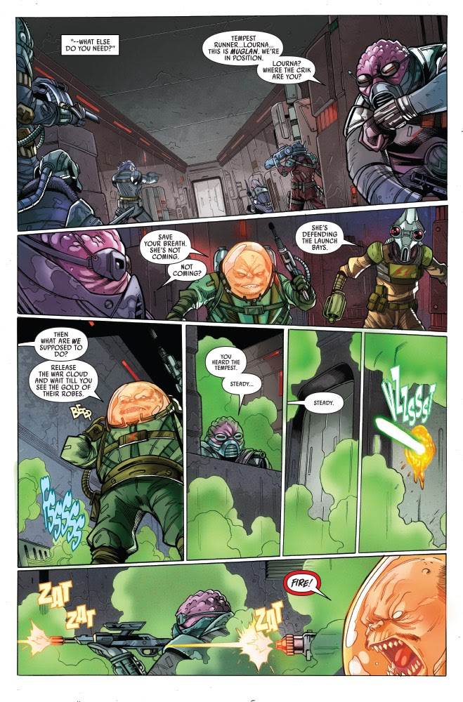 The High Republic #13 opens with the Nihil’s actual leader, the “Eye” named Marchion Ro, briefing his underlings on what to do in case of just such a Jedi assault. Basically Marchion tells them they’re on their own, as is his wont, and Dee and her fellow Tempest Runner Zeetar are left to fend for themselves as the Force-users resolutely board their “Great Hall,” almost Darth Vader-style.