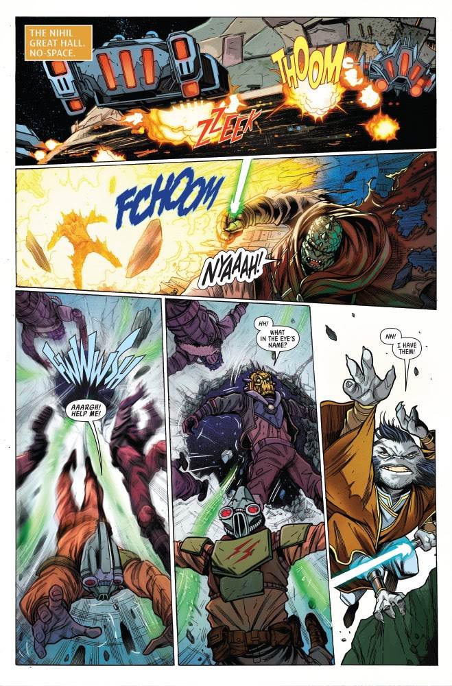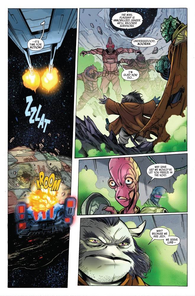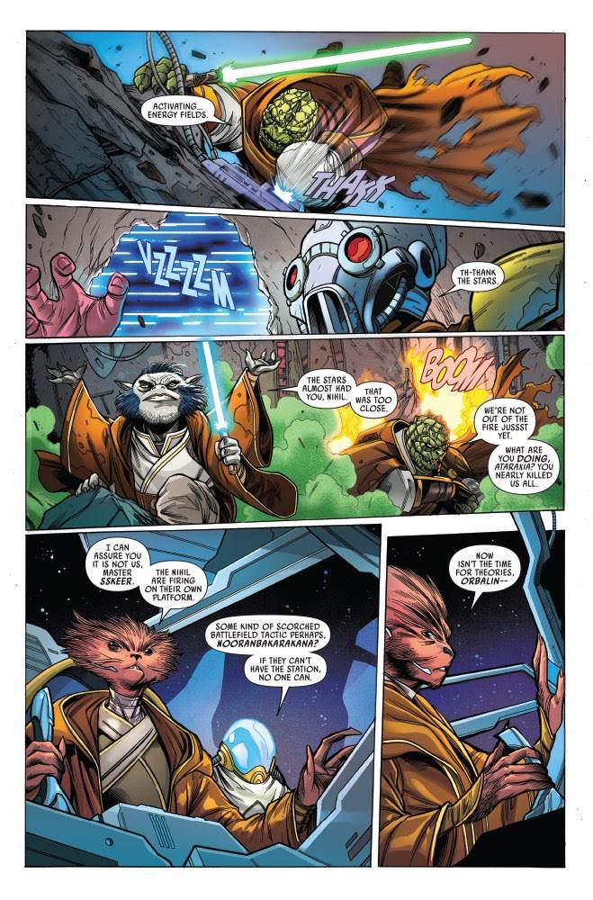 The High Repubic #14 begins where the previous issue left off, with a number of Jedi having taken the starcruiser Ataraxia to the Nihil’s Great Hall in the remote area of the galaxy known as No-Space, where the ruthless band of marauders have adopted the strategy of attacking their own base to kill the invaders (along with their own people who are still inside).