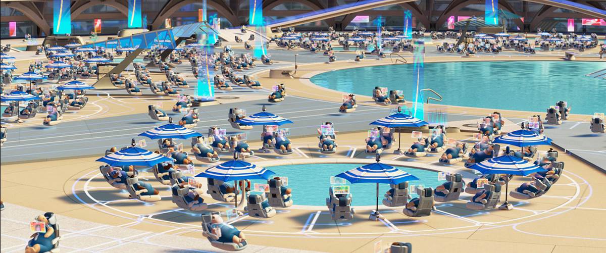 In the film, Humans have had to evacuate Earth and have boarded massive space cruise ships for what was intended to be 5 years while cleaning robots took care of the damage that humans caused to their home planet. Spoiler Alert: The ship was so luxurious (and the planet so devastated) that they remained aboard the luxury space liner for 700 years.