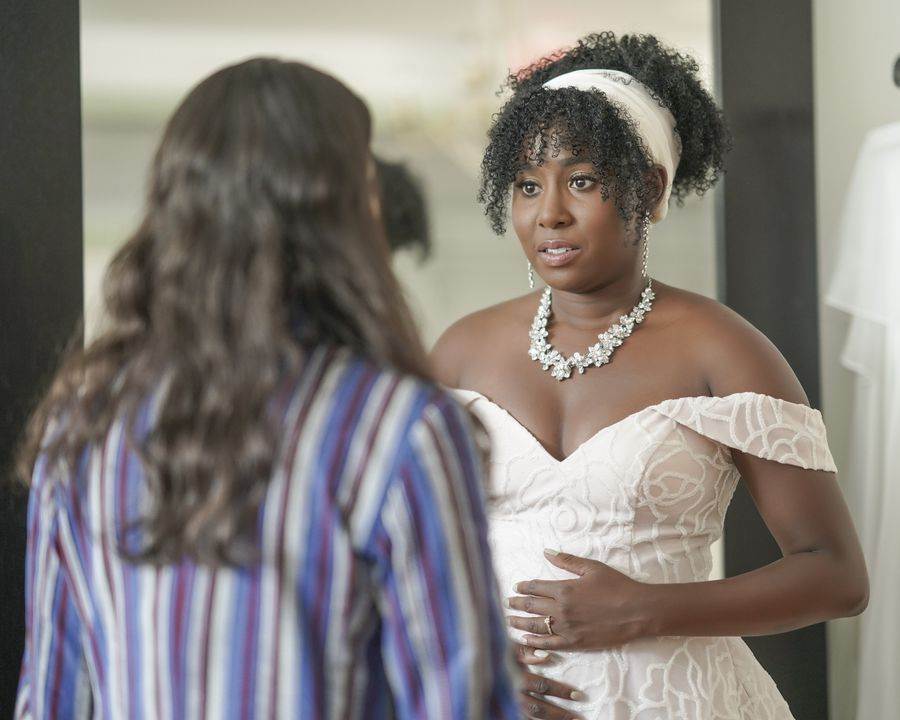 Back with the makeshift bridal crew, the tipsy bridesmaids start their separate journeys home. Sam meets up with the bride to check-in about her dress choice, but they both know the options were all equally rough. She continues to offer herself as a pair of extra eyes for Brit’s next fitting. Brit says thank you, but walks away, keeping her distance.