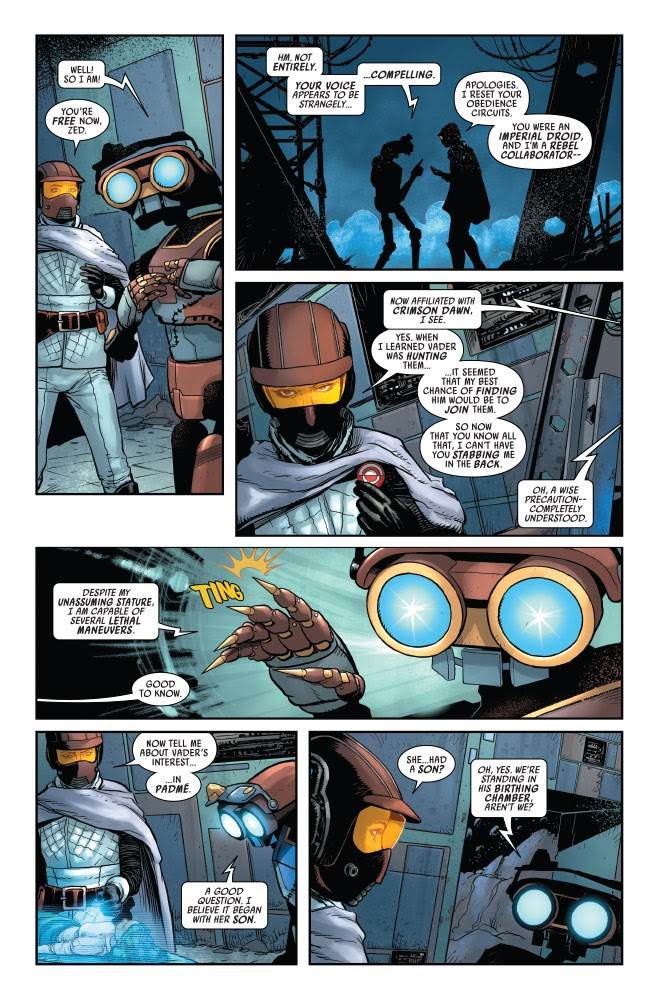 Now Sabé has made a discovery that brings her one step closer to understanding the reality of the situation: Padmé died in childbirth in the Polis Massa asteroid field, with the father of the male child (not to mention his twin sister, though that information remains hidden) being Jedi Knight Anakin Skywalker. Sabé plans to use this information against Vader, who appears to be hunting their offspring, Luke Skywalker, for reasons that she doesn’t quite grasp just yet… though they should be obvious to anyone who’s seen the Skywalker Saga of Star Wars movies. We also learn that Sabé is currently working with the criminal organization known as Crimson Dawn (this comic had to tie into Marvel’s current Star Wars crossover event Crimson Reign somehow) in an effort to get closer to the Dark Lord. She plants a half-fake list of Crimson Dawn collaborators where Vader and his team of lackeys can find it, and the targets start to get executed one by one. It’s pretty fun to watch the younger of the two Sith Lords storm into Emperor Palpatine’s office and start taking his lightsaber to advisors and guards, even though only some of them are aligned with Crimson Dawn.
