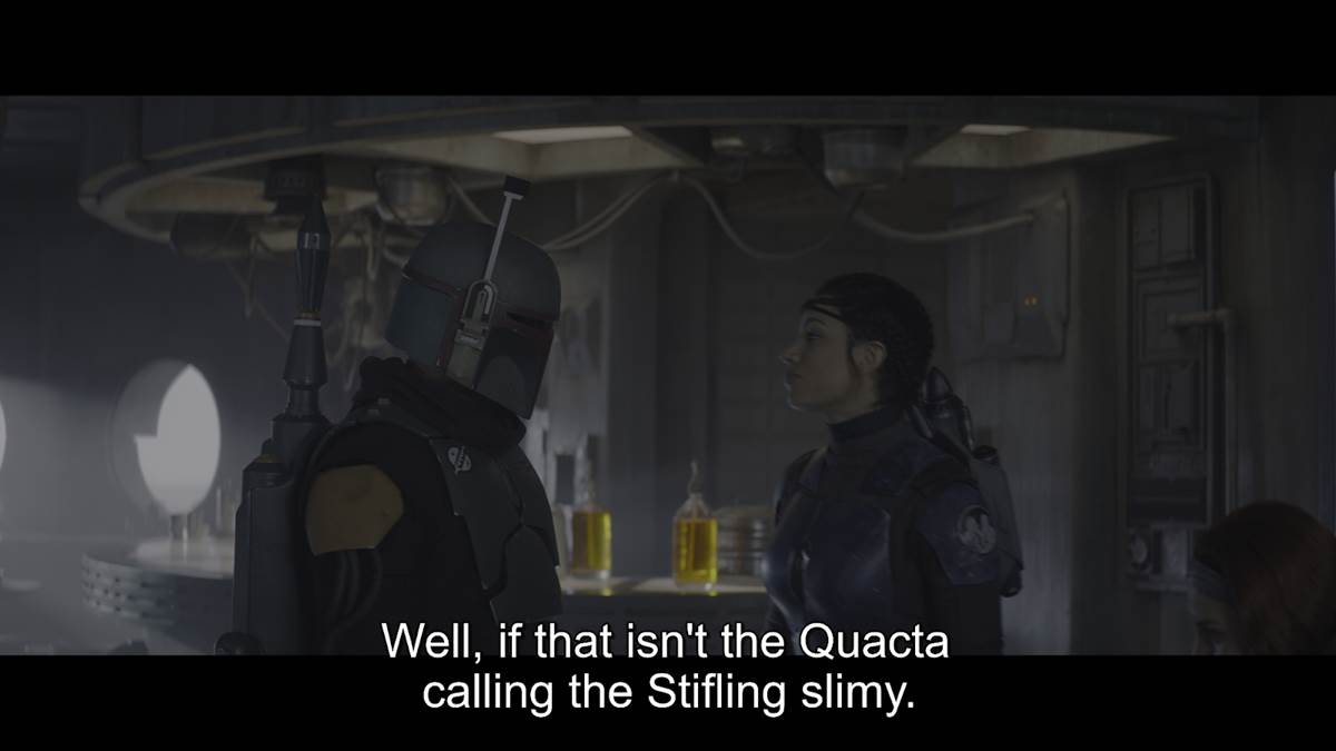 4 - “If that’s not the Quacta calling the Stifling slimy.”: Cad Bane echoes a line said by Boba Fett to the character Koska Reeves in The Mandalorian’s second-season finale “The Rescue.” I believe this is intended to further establish the long, often antagonistic relationship between the two bounty hunters, first seen together in Star Wars: The Clone Wars– not to mention a famously unproduced story arc of the same series, wherein Bane provided Fett with the nasty dent in his Beskar helmet via a duel.