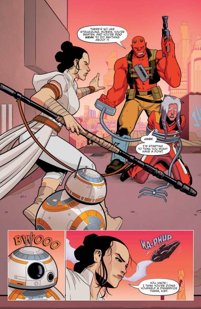 I’m going to start with issues #13 and 14 of Star Wars Adventures’ second volume, which were released on December 29th and yesterday (February 9), respectively. This seems like a good place to begin, because this pair of issues contains a two-part Rey story entitled “Repair Stop,” in which the crew of the Millennium Falcon (including Finn, Chewbacca, and BB-8) are forced to make an emergency landing on a backwater planet to obtain a part that burned out in the legendary ship’s engine. Their passenger, the smuggler Moebin Faltus, needs transport to the planet Prahvin in exchange for information about his remote sector’s smuggling operations for the Resistance. Once they’ve landed, Rey and Moebin search a local bazaar for the part they need while Finn and Chewie stay back to repair the Falcon. One run-in with bounty hunter Kief Varris later, and the story turns into an extended action/chase sequence with Rey and BB-8 stowing aboard Varris’s ship– a former Lambda-class Imperial shuttle. Written by George Mann (Star Wars: Myths & Fables) and illustrated by artist Butch Mapa (Marvel Action Avengers), this tale takes place between the movies The Last Jedi and The Rise of Skywalker– before Rey reforges the Skywalker lightsaber– and fits right in with the overall tone of the Star Wars sequel trilogy.