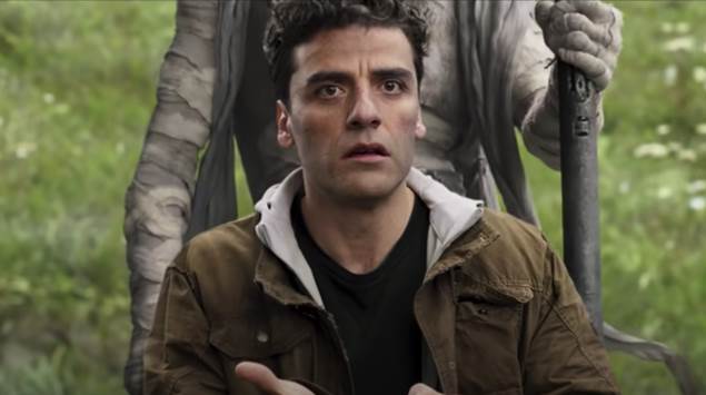 The teaser opens with Steven Grant, played by Oscar Isaac, kneeling in a field of some sort. Behind him we see an approaching white figure wrapped in bandages and carrying a staff. This is Khonshu, the moon god who gives Steven Grant, AKA Marc Spector, his abilities as Moon Knight. We even hear a ghostly voice utter the name “Steven.” Later in the teaser, we hear multiple voices calling his name as well.