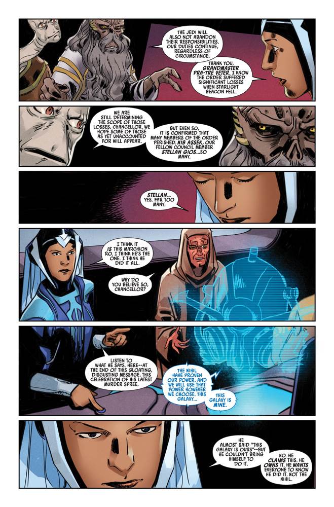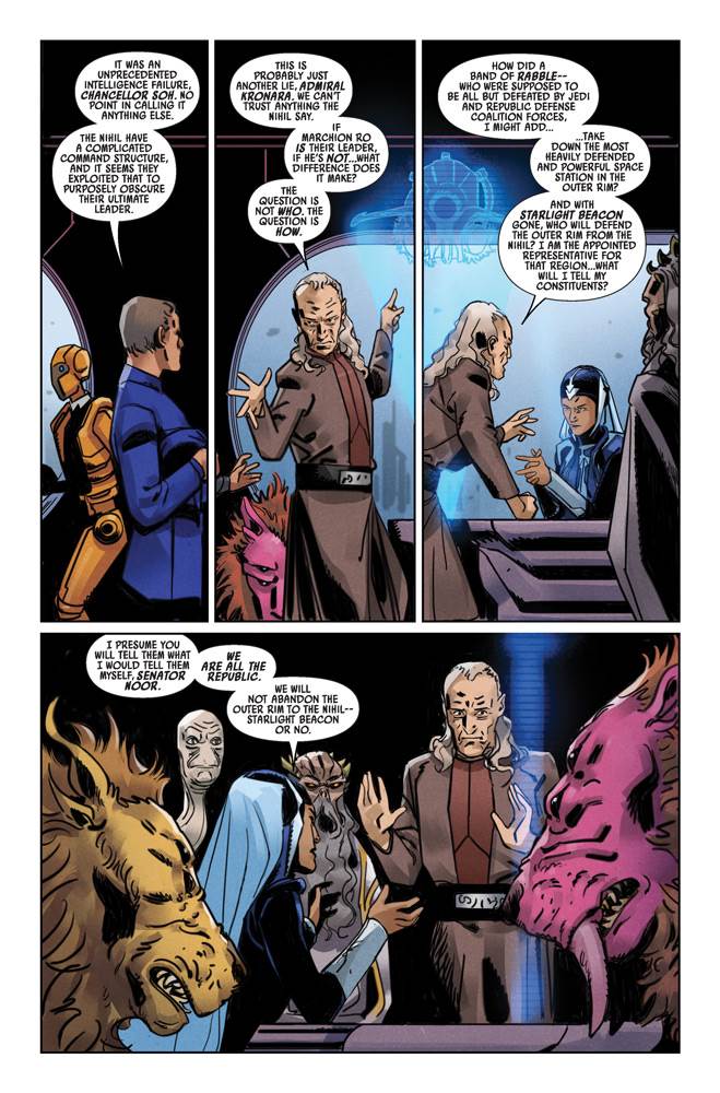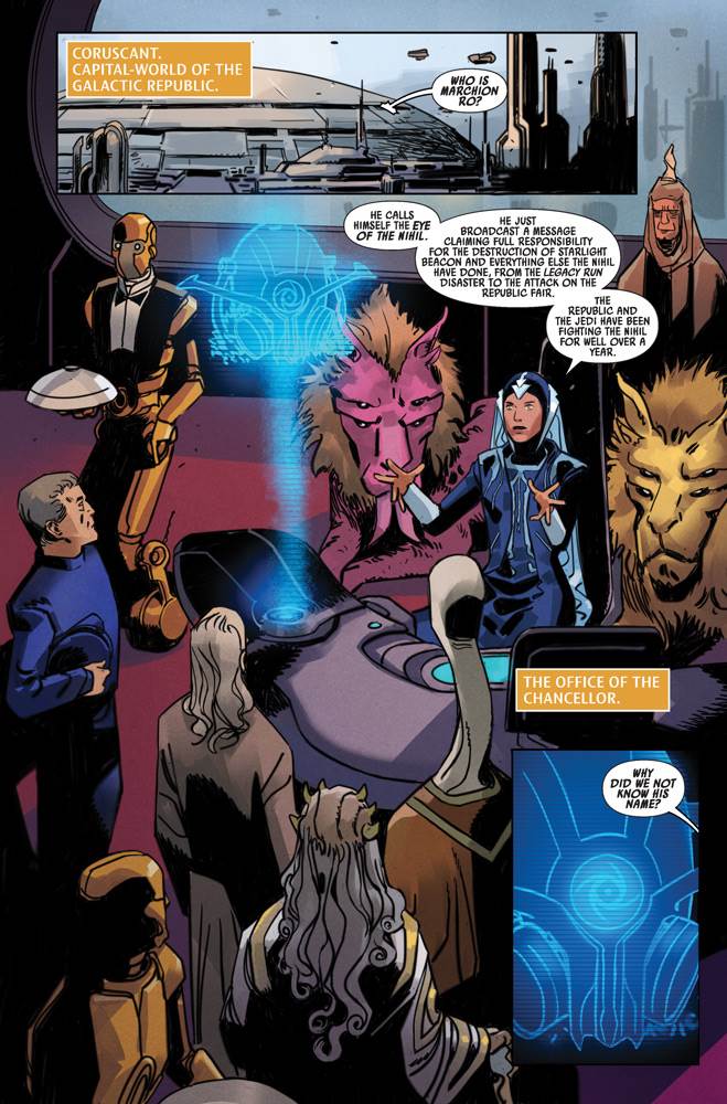Eye of the Storm #2 opens with a captive Jedi Master of the Parwan species named Obratuk Glii (usually seen in Daniel José Older’s Star Wars: The High Republic Adventures comic from IDW) forced to listen to Ro boast about Starlight’s disastrous fall. Then we cut to Coruscant, where Supreme Chancellor Lina Soh is briefing her advisors on fallout from the Nihil attack.