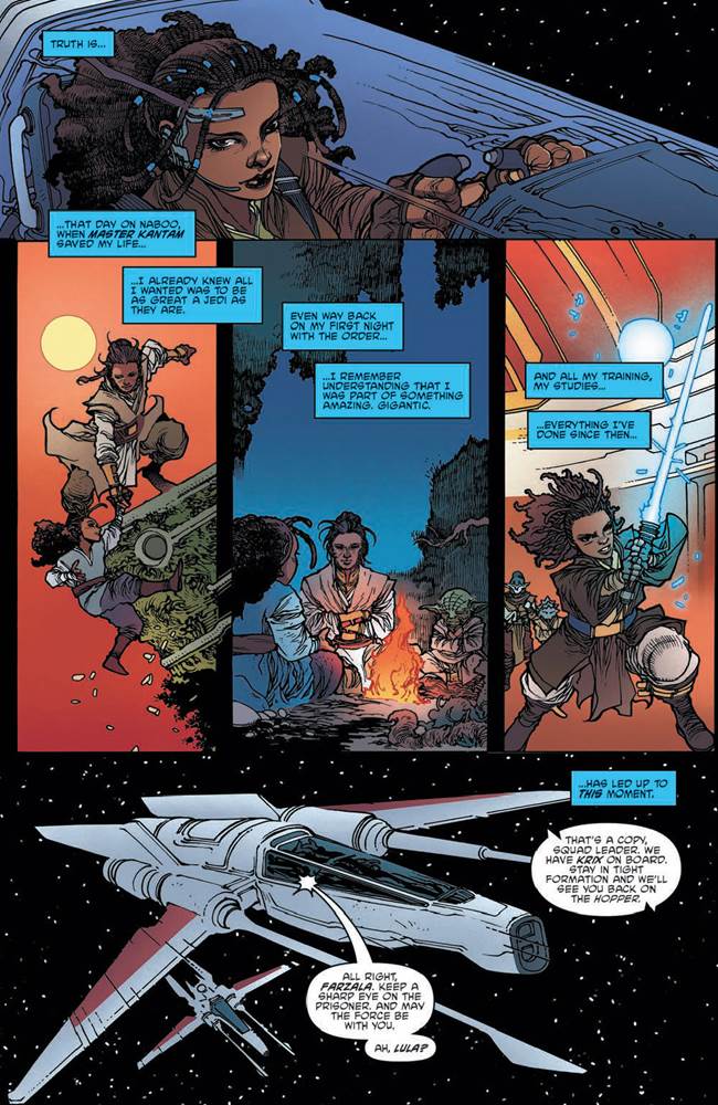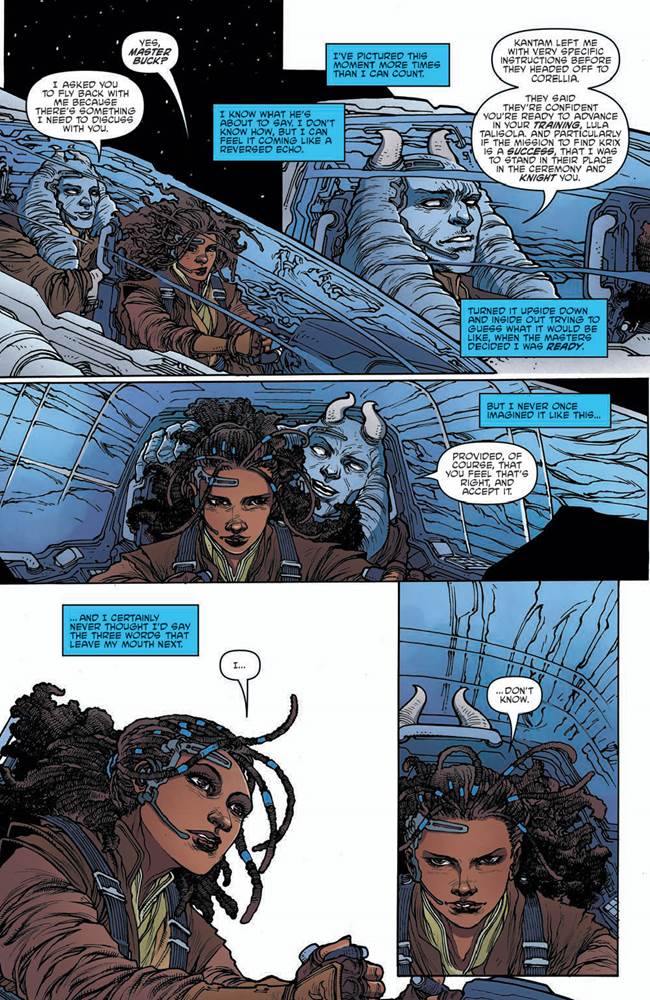 I feel like I’ve been tough on the tone of Daniel José Older’s writing occasionally over the past couple years, but one thing he is undeniably excellent at is gradually making his readers care about and become invested in the characters in his stories. That’s become very true of Jedi Padawan Lula Talisola and her Force-sensitive (but non-Jedi) friend / eventual love interest Zeen Mrala, who are the two leads of this comic.