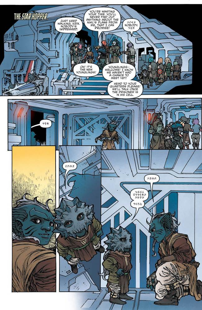 The High Republic Adventures #13 opens with Zeen and Lula having worked together with some other Jedi companions to capture Zeen’s childhood best friend Krix Kamerat, who was captured and recruited by the ruthless band of marauders known at the Nihil at the same point that Zeen fell in with the Jedi Order– around the time of the Great Disaster which launched The High Republic’s overarching narrative. On their way back to the Jedi cruiser the Star Hopper, Lula is pulled aside by Master Torban “Buckets of Blood” Buck and asked if she feels she’s ready to become a full-fledged Jedi Knight. Knowing that her feelings for Zeen conflict with the Jedi rule of non-attachment, Lula hesitantly responds that she’s genuinely not sure, and then on the Star Hopper we get more of the tense interrogation scene between Zeen and Krix that we saw parts of in Older’s recent young-adult novel Star Wars: The High Republic - Midnight Horizon. Meanwhile, a new class of younglings is introduced into the group, and Qort becomes an immediate mentor to another member of his Aloxian species.