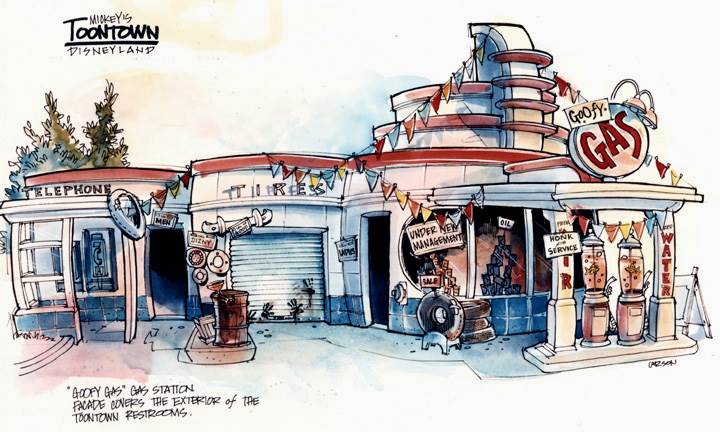 Aside from the bevy of things to do and see across the small acreage of this corner of Disneyland, the land was touted for its incredibly immersive design, many arguing that it marked a new era in the art of Theme Park design. Once guests pass under the train tracks, they are transported into a world of cartoons, with buildings designed in wonky, cartoony ways. Animated sounds like foghorns and tuba noises all fill the air, and even the area music is designed to be like the background music in a cartoon. Anywhere the real world could be seen was covered by a painted flat to look like animated hills on the horizon, or a distant part of a downtown animated skyline depending where in the land you were. Even in Disneyland, you felt like you were somewhere else entirely.