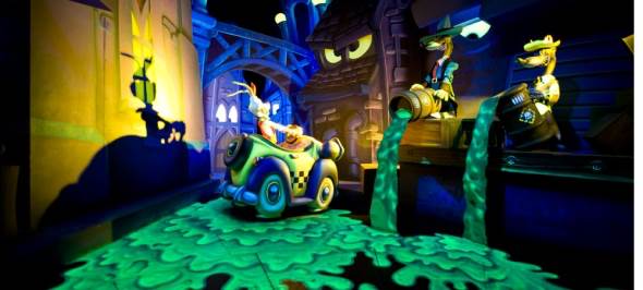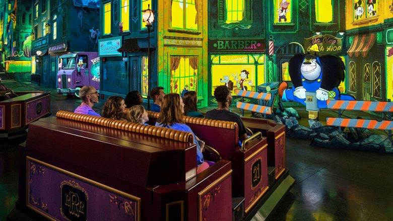 Imagineer Joe Lanzisero once explained that they took a teacup from the park’s Mad Tea Party attraction and placed it on Pinocchio’s Daring Journey and took a spin on the attraction that way, and it was “a marriage made in Disneyland.” However, one thing that they learned was that suddenly guests would be able to see things that they weren’t meant to see. IE Lighting rigs, the backsides of a facade, etc. So when developing Roger Rabbit’s Car Toon Spin, they had to think literally from all angles. The vehicle is at the control of the guests, so they can turn and see things at their leisure, though more often than not, they’d be spinning so quickly it would flash by in the blink of an eye. This means that Roger Rabbit’s Cartoon Spin is an almost fully realized environment, with the capability for guests to see new and different things each time they ride. And waiting in line to experience the attraction isn’t that much of a chore either since it marked one of the first (if not the first) fully immersive queue in the industry, taking guests through Toontown environments and alleys, past the Ink and Paint Club, and seeing animatronic versions of Baby Herman, the weasels, and others from Who Framed Roger Rabbit, all setting up the story for the adventure the guests are about to set on.